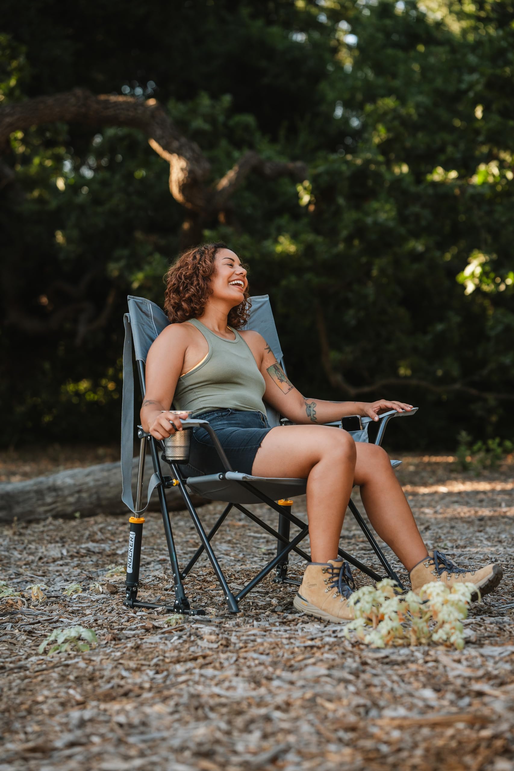 - Simple Setup: This rocking camp chair for adults opens and closes smoothly; This folding camping chair for adults also features a convenient carry strap