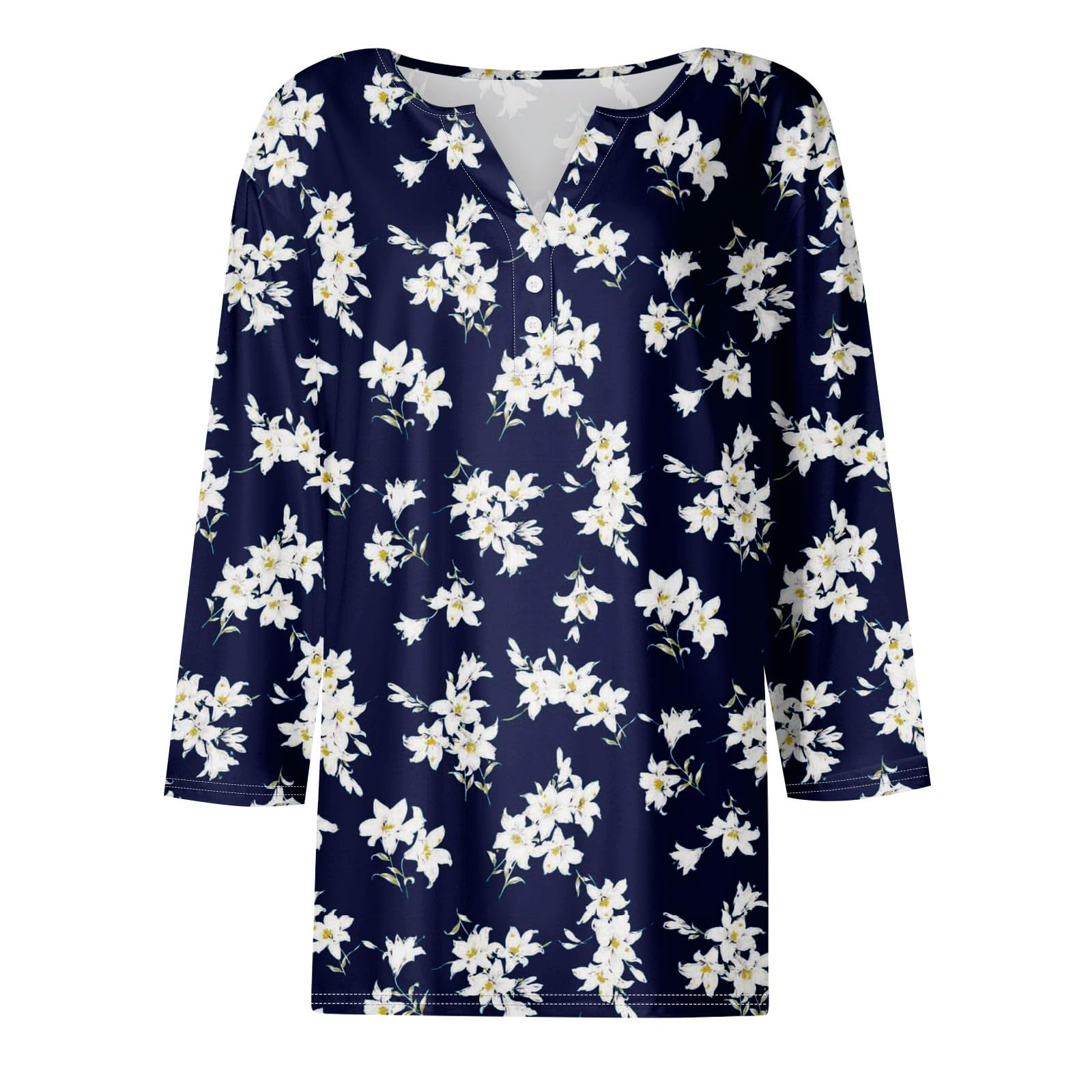 Generic 3/4 Sleeve T Shirts for Women Summer V Neck T Shirts for Women 3/4 Length Sleeve Trendy Tops for Women 2024 Floral Print Blouses for Women Casual Aesthetic Clothes Royal Blue S