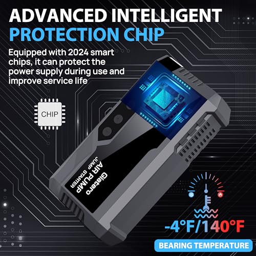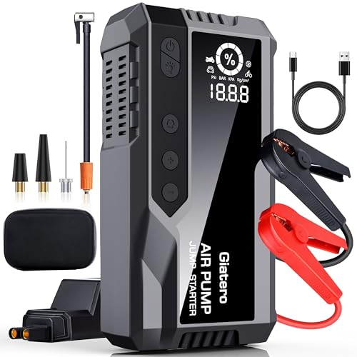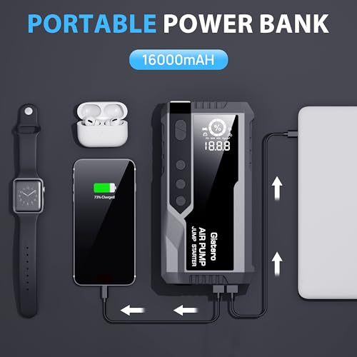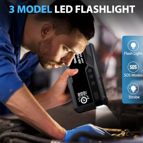 - 5 IN 1 CAR JUMP STARTER - Giatero car jump starter is not only a jump box, power bank, air compressor, and 3 variable light modes (flashlight, strobe, and SOS), dual USB ports for charging smartphones, tablets. There are more features like an LCD screen for checking battery status, a wide operating temperature from -4°F to 140°F (-20℃~60℃), and 36 months of standby time. It will be a great friend for camping, outdoors, emergencies and traveling