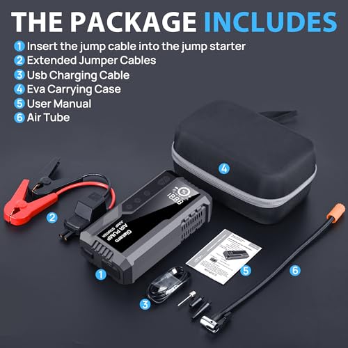 - PACKAGE CONTENT - 1 X jump starter with air compressor, 1 X smart jumper cables, 1 X air pump hose, 3 X gas nozzles, 1 X Type-C Charging Cable, 1* user manual, 1* portable EVA carrying case. If you have a problem with our product, please feel free to contact us and we will do our best to solve it for you