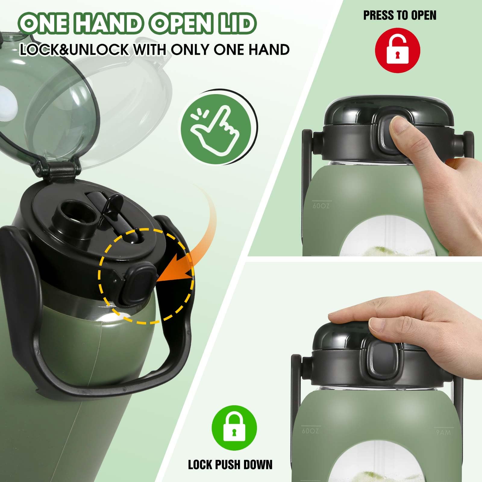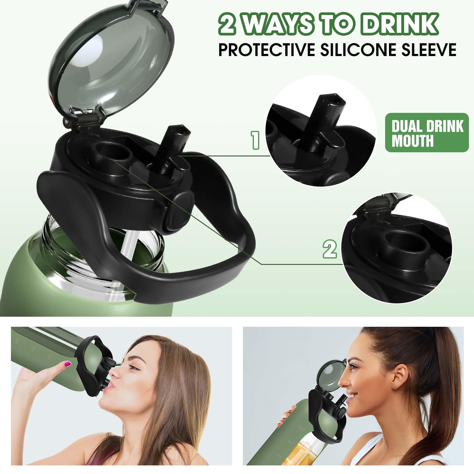- Versatile Hydration-Friendly Design: Our timed water bottle features a unique dual-mouth lid, allowing you to switch drinking options between spout and straw anytime, anywhere. Say goodbye to constant lid changes. The press-and-push button lid design enables easy one-handed and leak-proof drinking.