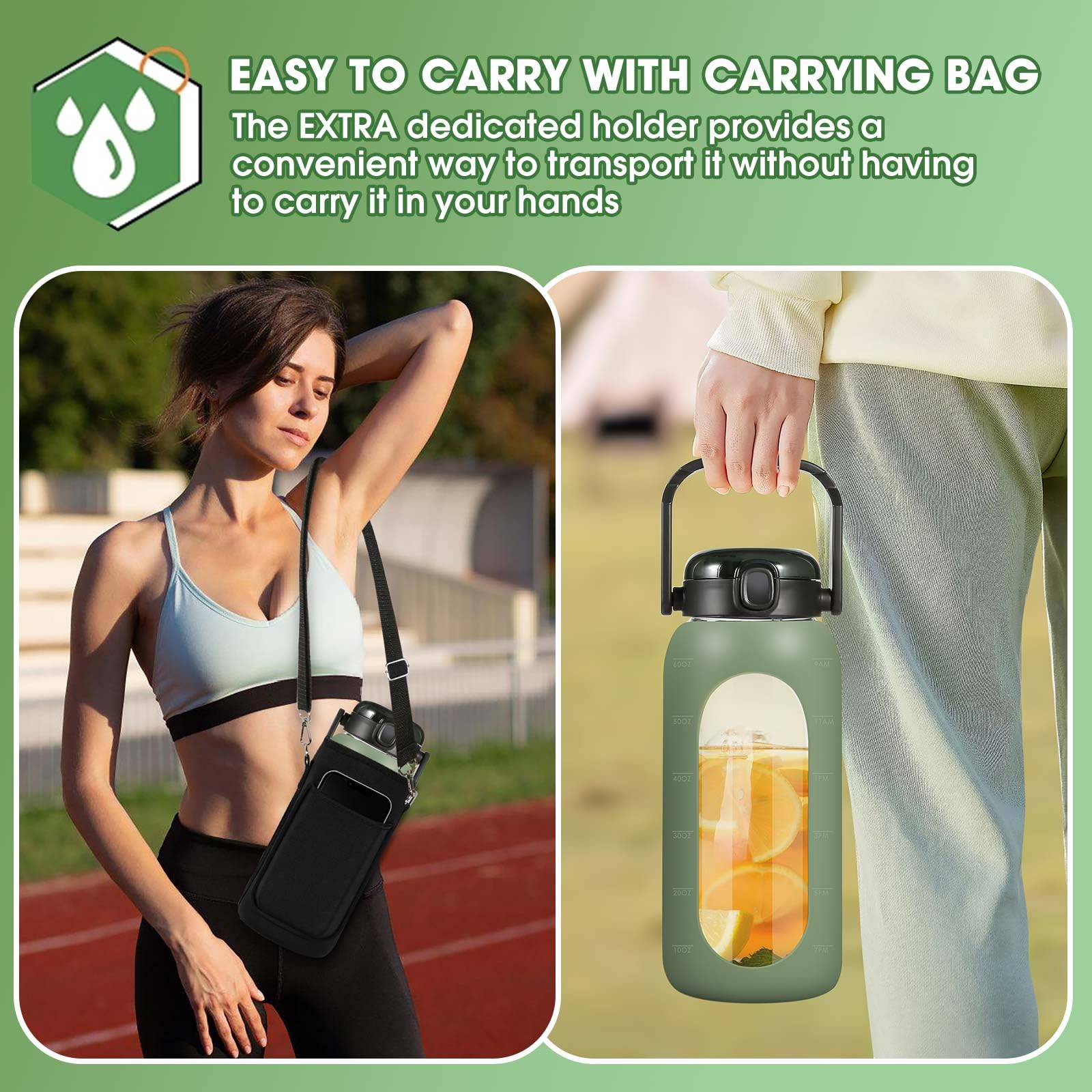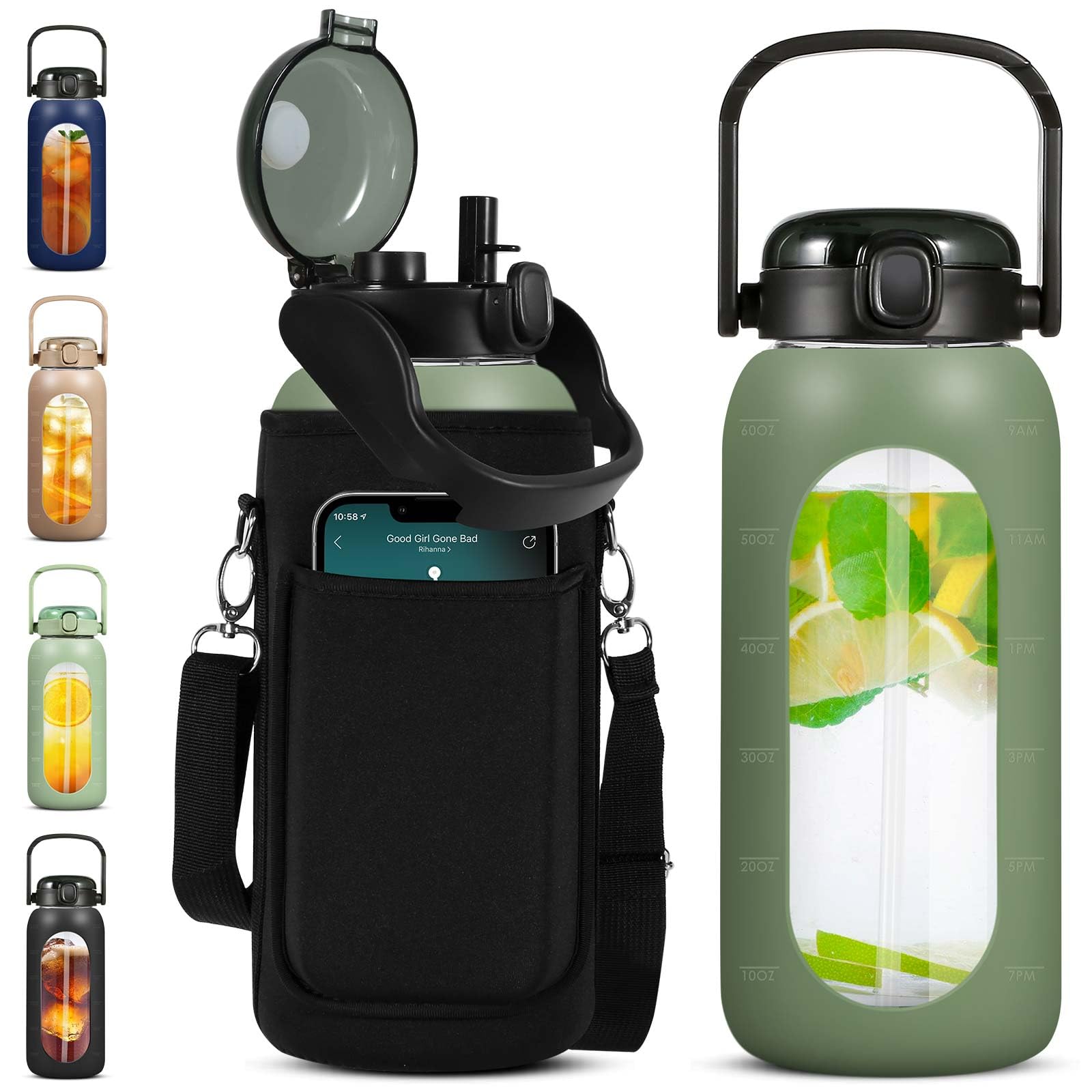 Glass Water Bottles 64 oz - Large Half Gallon Motivational Glass Water Bottle with Time Marker Straw Phone Holder Handle, 64oz Daily Water Intake Jug with Silicone Sleeve for Office Work Gym Olive