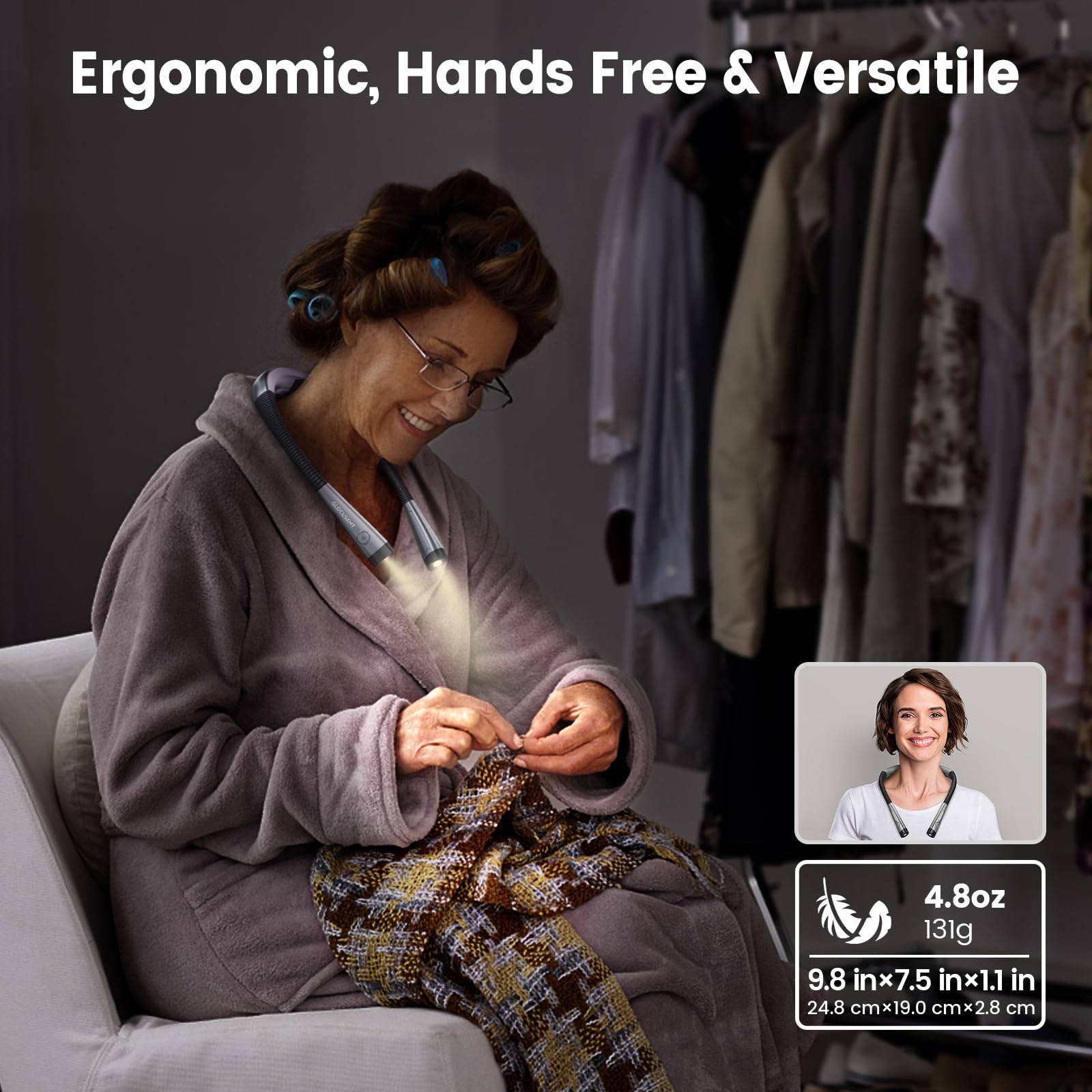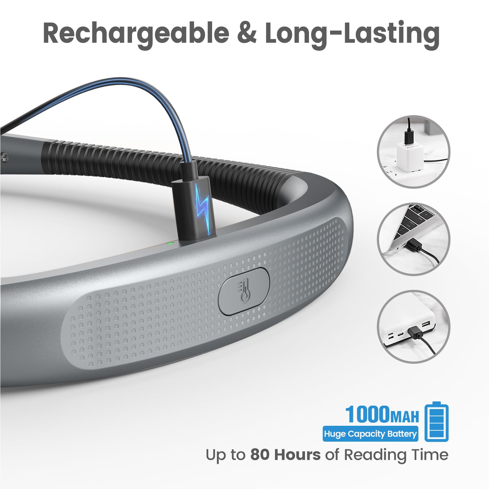 - [Rechargeable & Long-Lasting] This neck reading light rechargeable with USB Type-C which is reversible and therefore easier to plug in compared with other neck lights for crafts charged with Micro-USB. Up to 80 hours (general reading, single head) of powerful, non-diminishing brightness from the included premium rechargeable 1000mAh battery. A long lasting usb rechargeable book light for reading in bed.