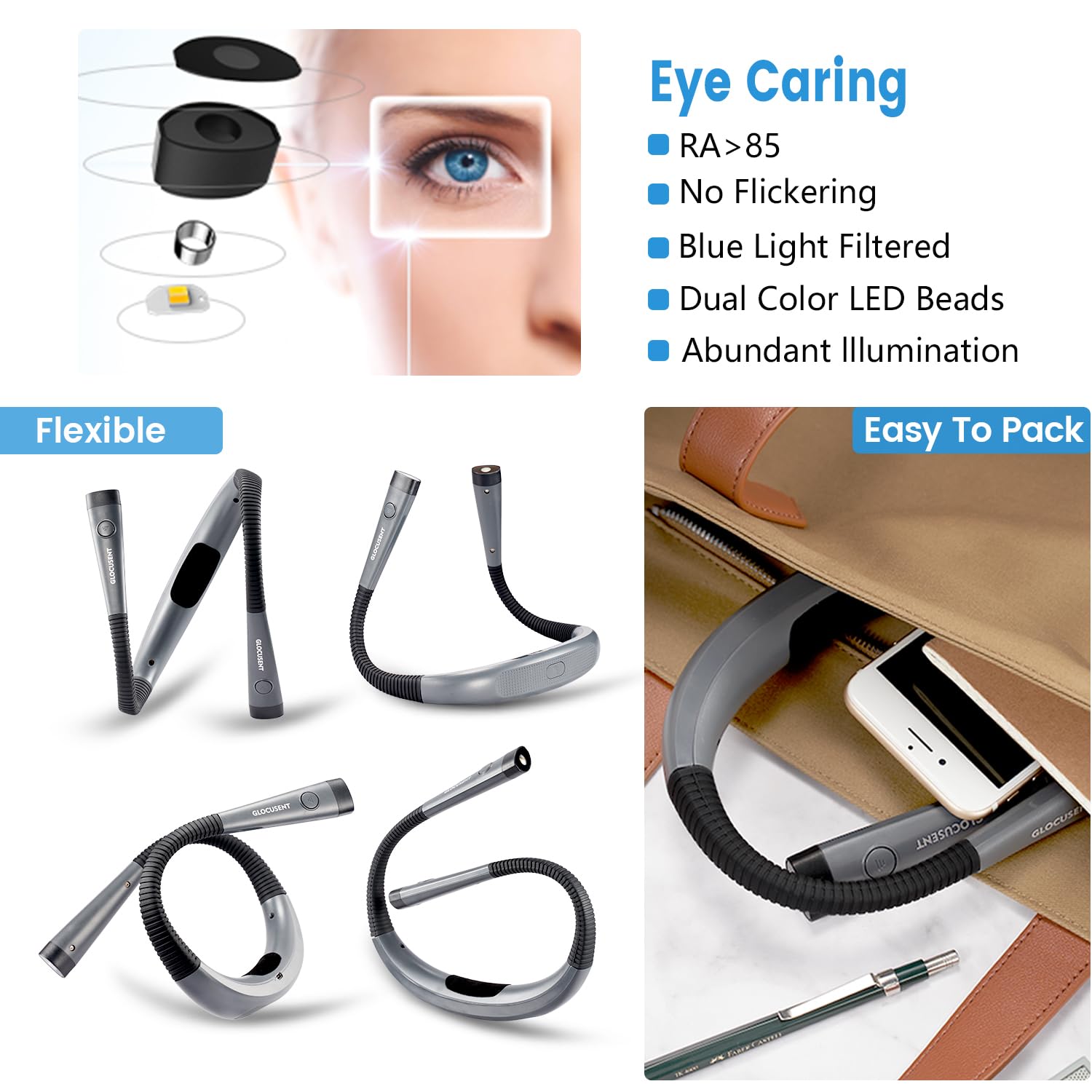 - [Eye Caring & Ergonomic Design] Blue light filter and no flickering design by the advanced LED beads of the Glocusent reading light. Compared with other reading lights for books in bed, you feel no more eye strain with the Glocusent book light. The arms of the reading light around your neck are supple and adjustable so you can get the angle most comfortable for you. This around the neck reading light is ergonomically designed, it is an exceptional handsfree neck lamp for reading!