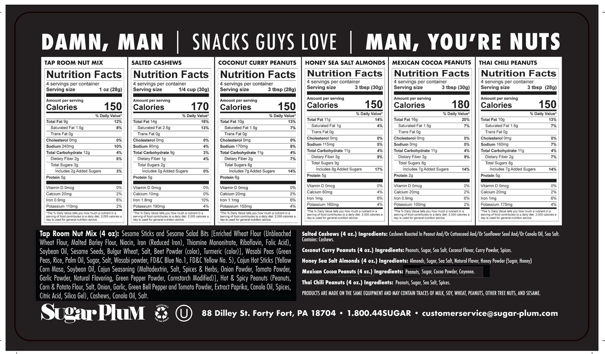 - 6 BAGS OF UNIQUE FLAVORED NUTS – Salted Cashews, Honey Sea Salt Almonds, Coconut Curry Peanuts, Thai Chili Peanuts, Mexican Cocoa Peanuts and Beer Nuts Mix (Cashews, Sesame Sticks, Wasabi Peas, Cajun Hot Sticks, Spicy Peanuts); Each nut bag weighs 4 oz and is resealable: 1 1/2 pounds of nuts