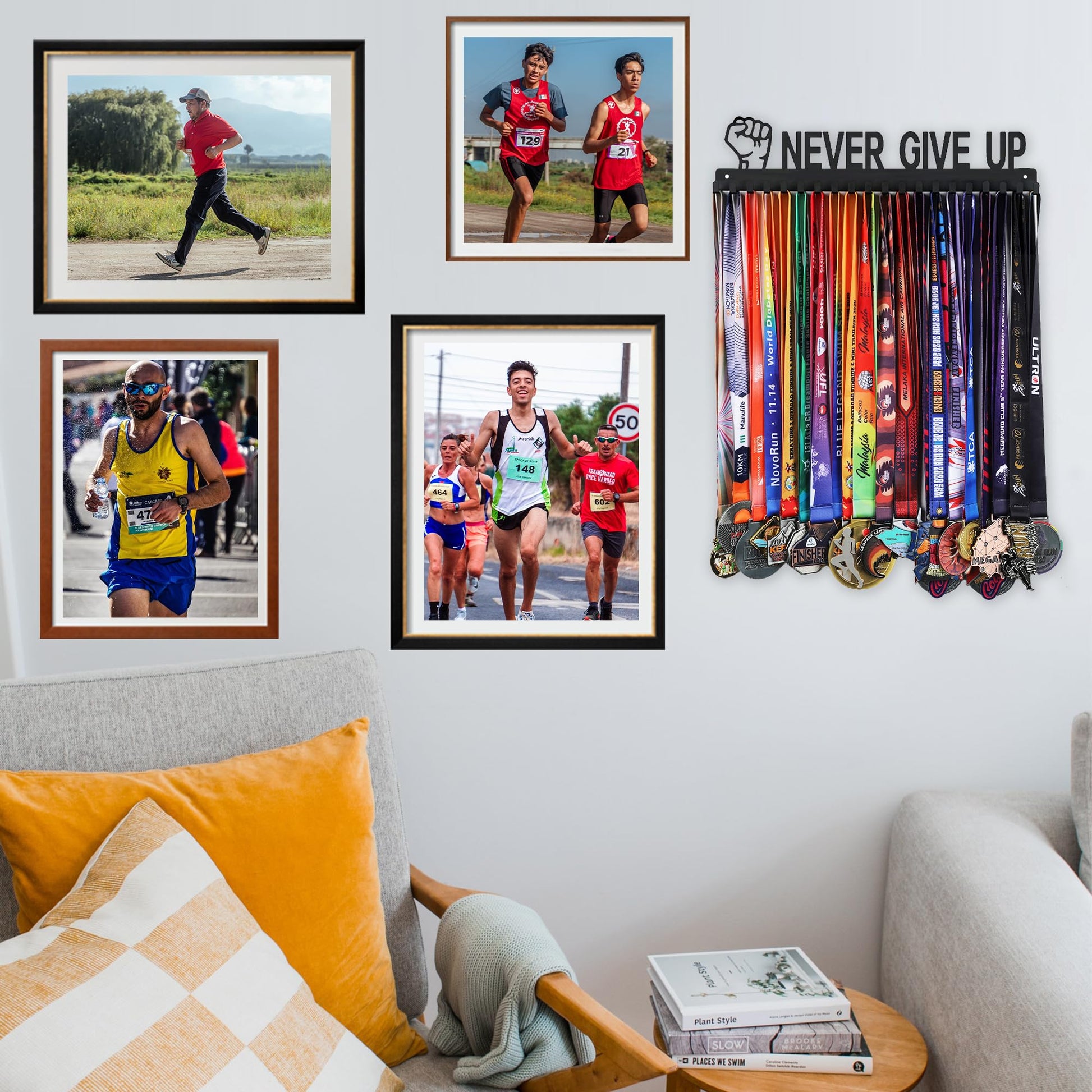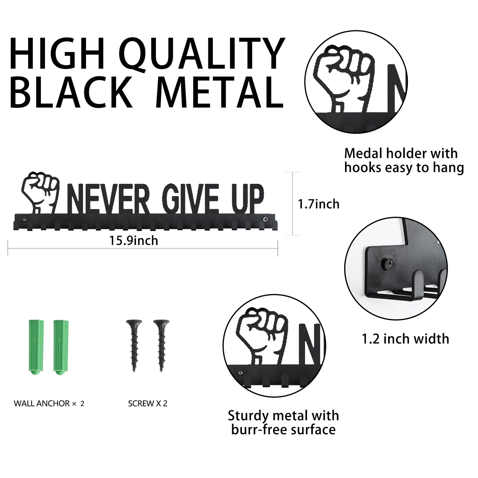 Goutoports Medal Hanger Display Rack - Never Give Up Sports Award Ribbon Hanger with 20 Hooks Hold Up 60 Medals - Durable Metal Holder for Running Showcase and Protect Your Medals in Style