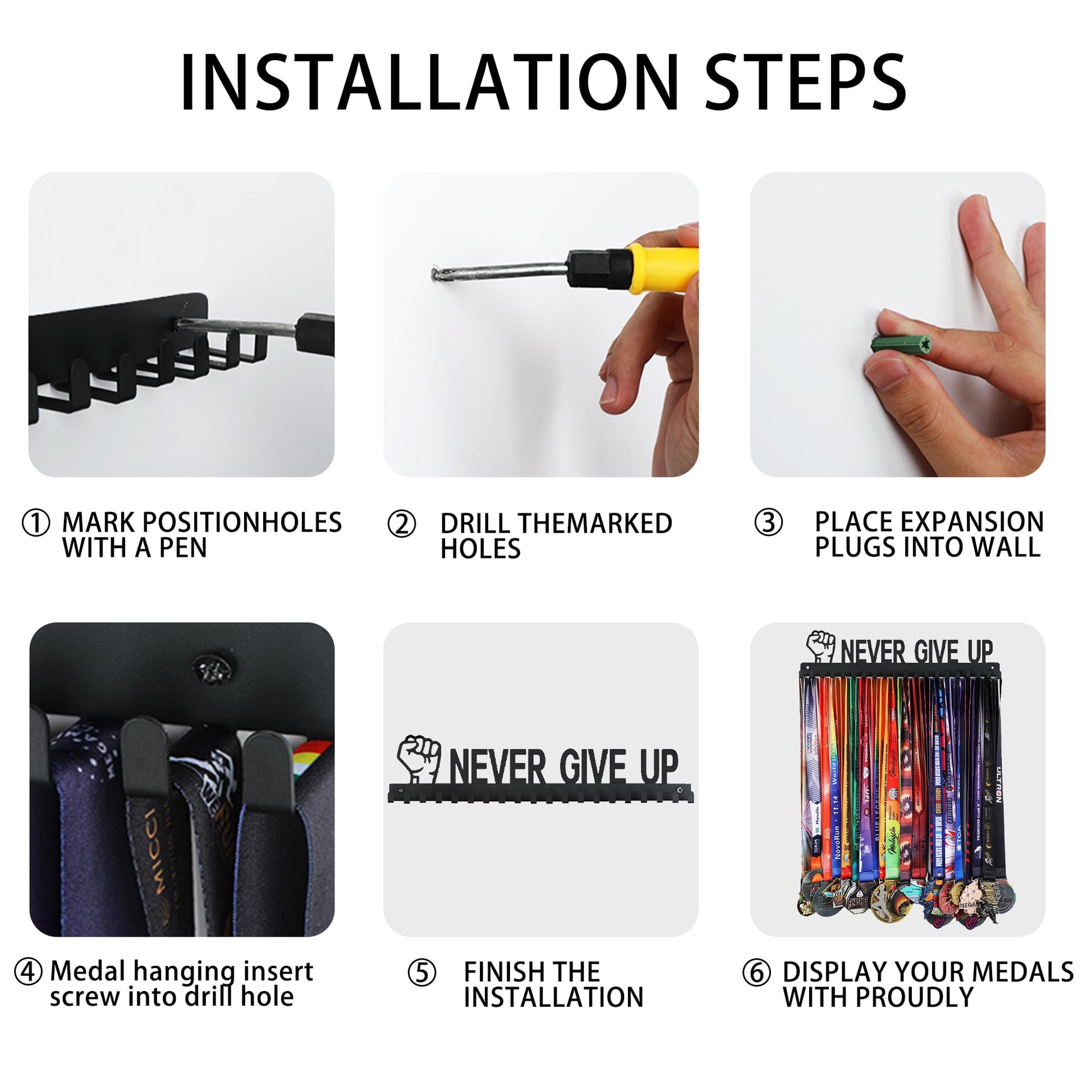 - 【Powerful Multi Purpose】 Goutoports medal hanger is suitable for both indoor and outdoor use. It can be easily mounted on any wall surface, whether it be in schools, workshops, offices, homes, or even on wood surfaces. Hooks hold medals securely in place, preventing them from slipping out or being damaged. Its strong steel construction ensures that it does not bend easily, making it an ideal choice for athletes who have a large collection of medals.