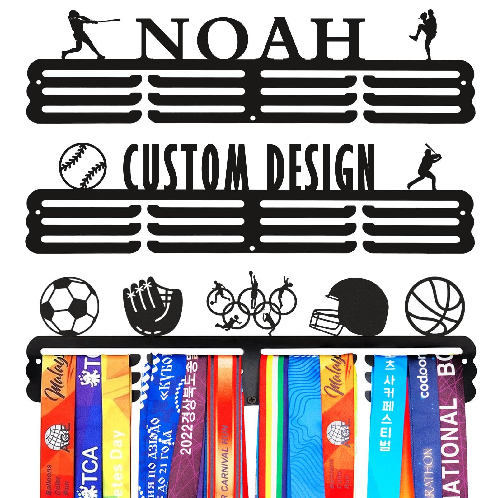 - Personalized For Baseball Enthusiasts: Customize your baseball medal hanger display rack with your name or slogan and decorative baseball graphics. Available in various sizes and colors to meet your specific needs. Perfect for baseball players who want to display their hard-earned medals and trophies. This medal hanger measures 16 inches long.