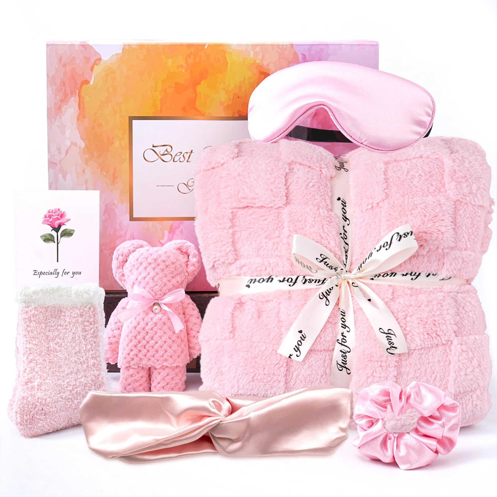 - 8PCS Luxury Gift Set for Every Celebration:Discover the perfect birthday gift box or gift baskets for women with this curated collection! Unbox joy with a plush flannel blanket, adorable bear-shaped towel, fuzzy socks, silk eye mask & headband, hair elastics, a greeting card, and an elegant gift box. Ideal for showing appreciation as teacher appreciation gifts, or for sending comfort with get well soon gift baskets for women and get better soon care package for women, all items combine comfort, style, and convenience in one package.