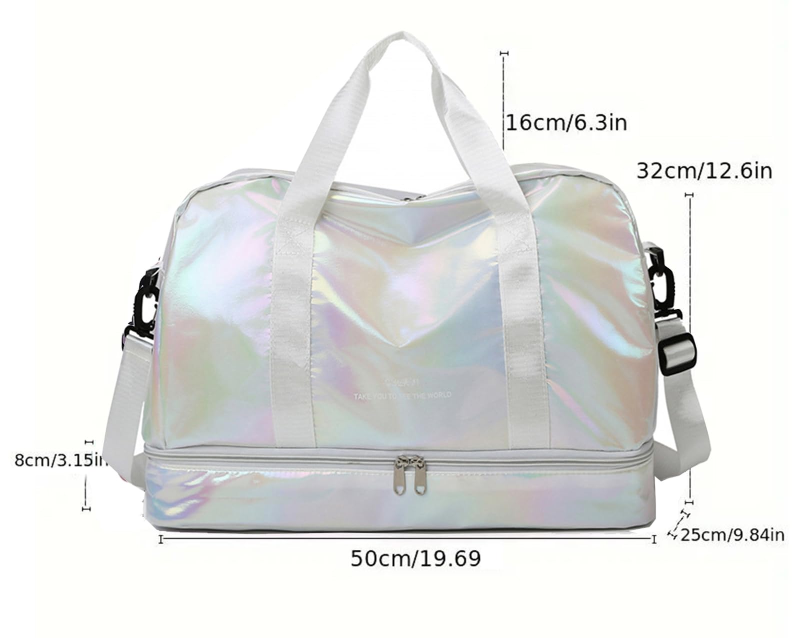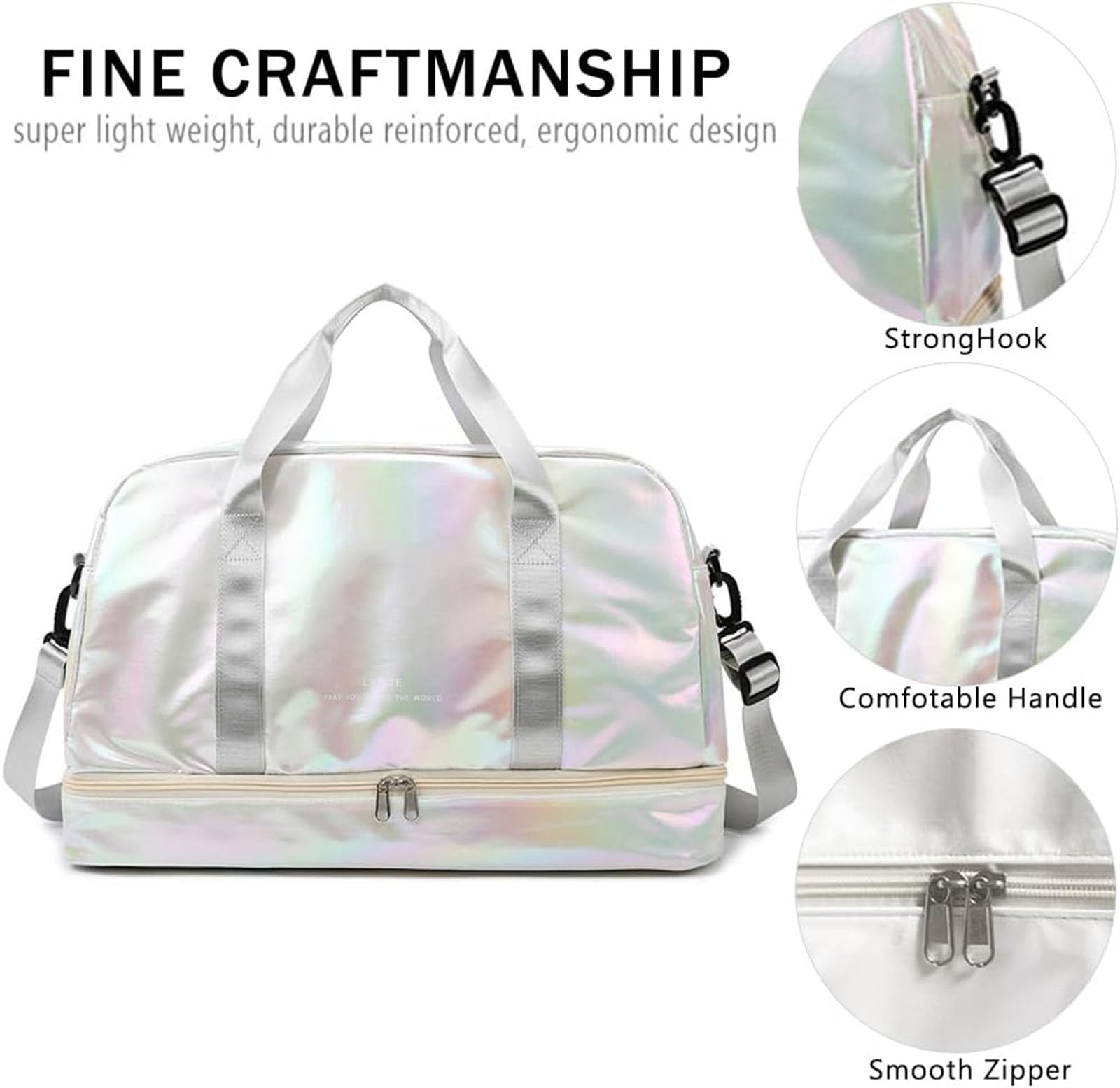 - [Pearl luster design and material]This standout gym bag for women showcases an eye-catching Pearl luster design that creates a unique visual effect.Our dance duffle bags for is made of water resistant polyester,lightweight,strong and durable,breathable and tear-resistant