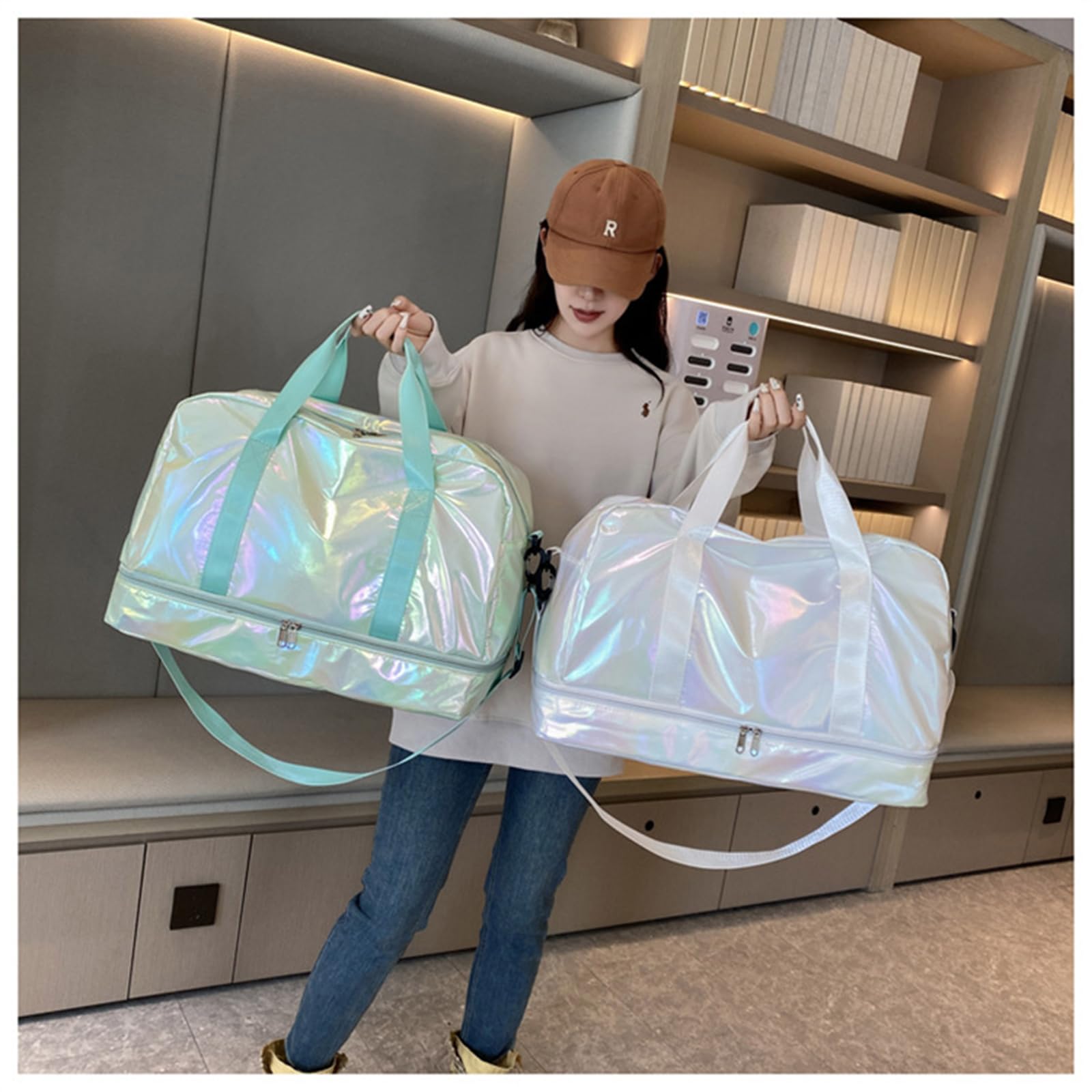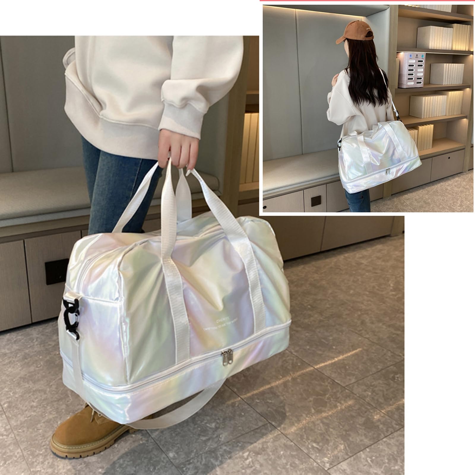 Gym yoga Bag Dry Wet Separated,Sports Travel Duffel Bag,Weekender Overnight Carry On Bag with Shoes Compartment Wet Pocket Women Travel Foldable Bag (fluorescent white)