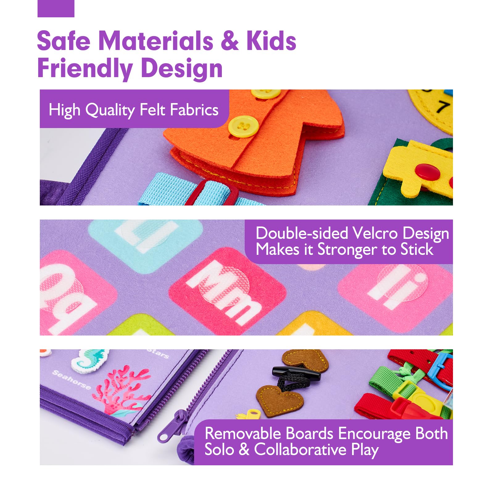 - Portable Travel Toys: The 11×9 inches size perfectly fits most diaper bags. Furthermore, there's a removable zipper design on cognitive boards, and it has a sturdy handle for easy carrying. It will be an excellent choice for travel activities and toddler toys. If you are looking for a busy book for toddlers 1-3, ours is definitely the perfect gift ideal that's not messy, noisy or screen time.