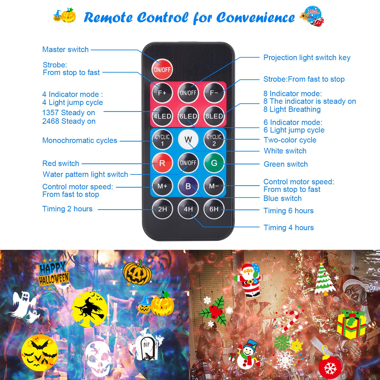 - Convenient Remote Control & Timer Function: The Halloween and Christmas projector lights are equipped with a remote control for adjusting light color, motion speed, flash speed, and timer settings (automatically turning off after 2/4/6 hours),which is convenient for you to choose the appropriate lighting time and avoid extra electricity bills