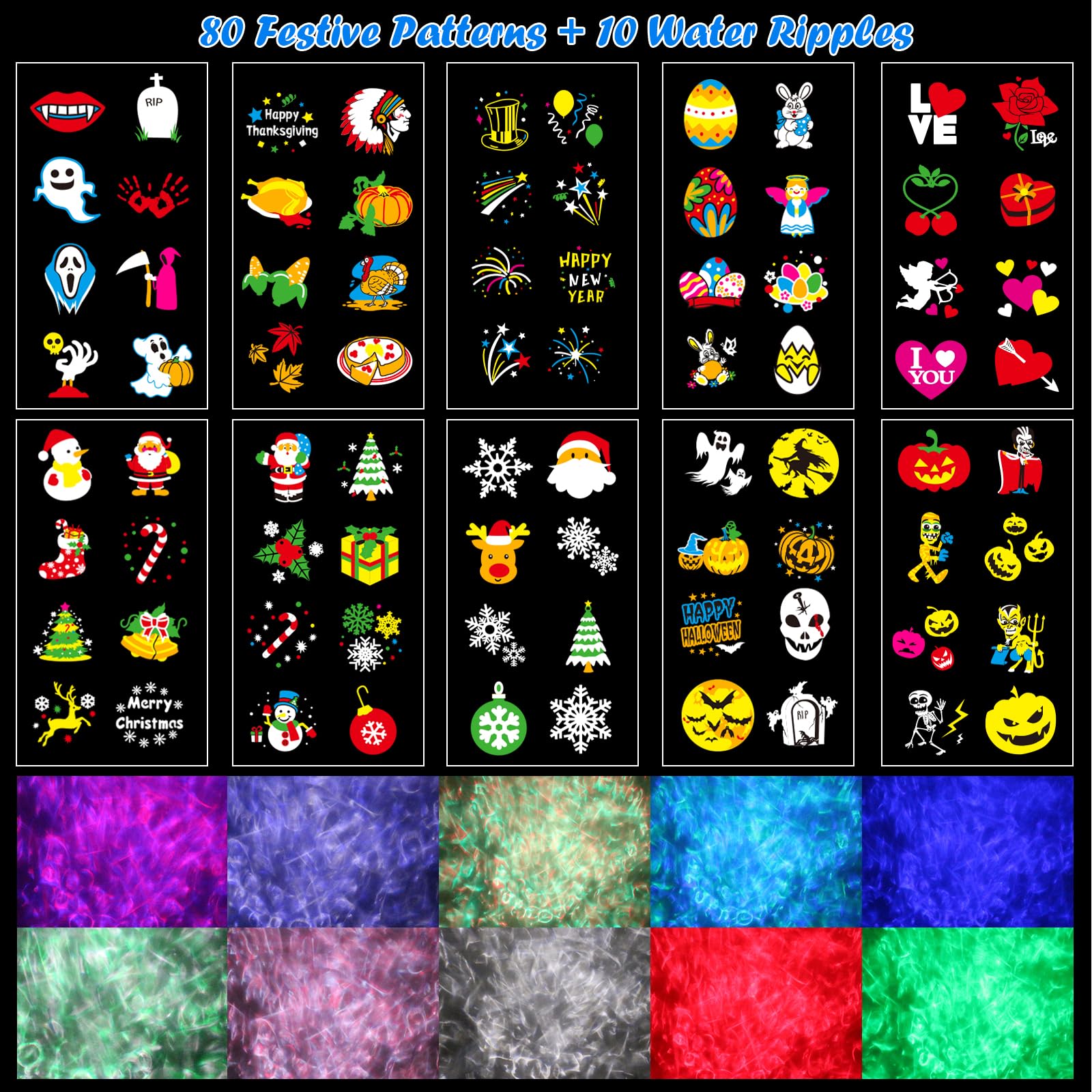 - Display 8 Patterns at A Time: Our newest outdoor Halloween projector light can display 8 festival patterns simultaneously, offering more options than previous models that could only show 4 or 6 patterns. It includes 10 interchangeable slides with classic elements from holidays and occasions such as Christmas, Halloween, Thanksgiving, New Year, Easter, and Valentine's Day, making it suitable for year-round use.