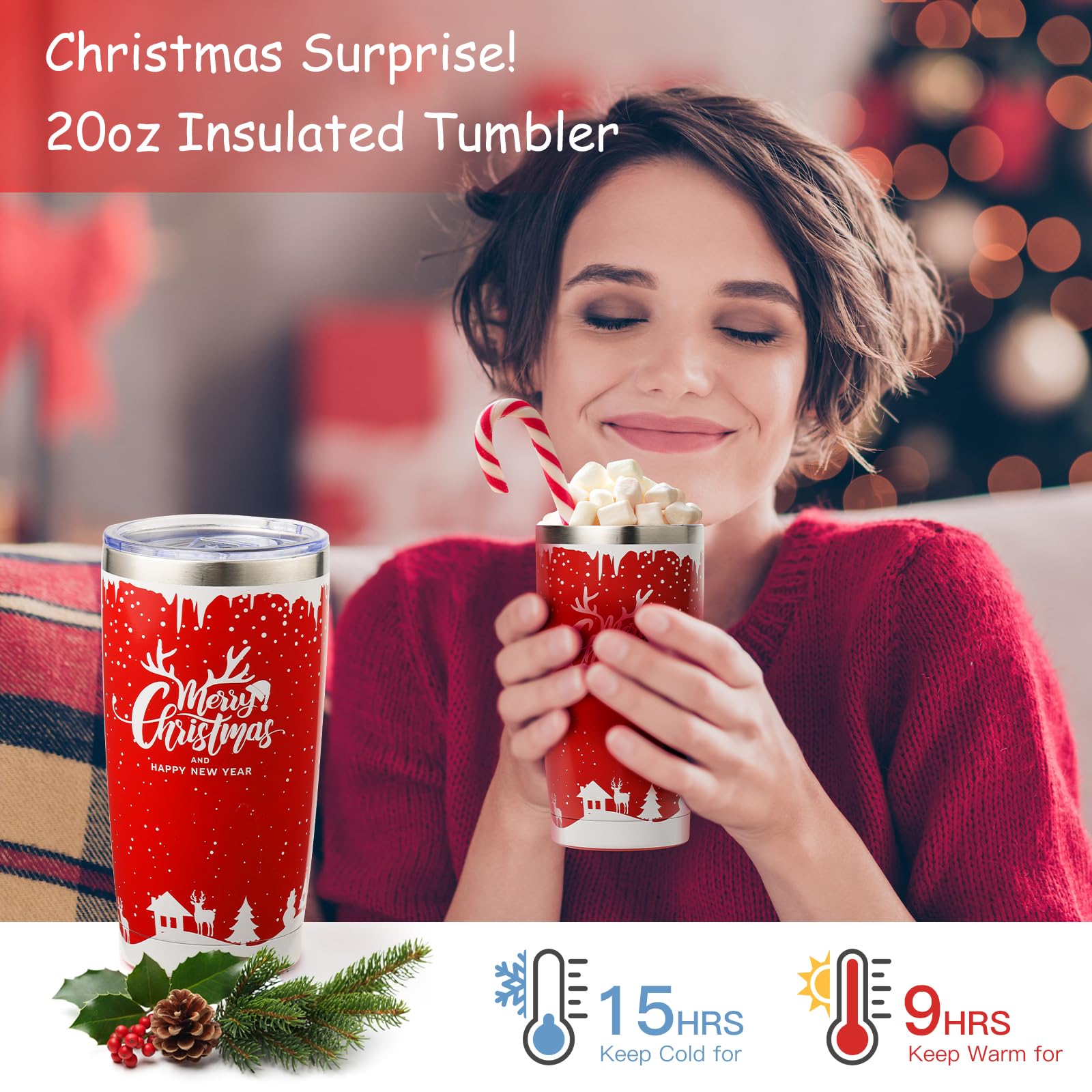 - 💞💞【Happy New Year Tumbler Gifts for Her】The 20oz coffee mug with the blessing words 'Merry Christmas and Happy New Year' is made of premium 18/8 food-grade stainless steel. The double-wall insulated design can keep your drinks hot or cold for hours. This is the perfect season to enjoy hot cocoa or drinks with family and friends, and the gifts can also be used as holiday decorations.
