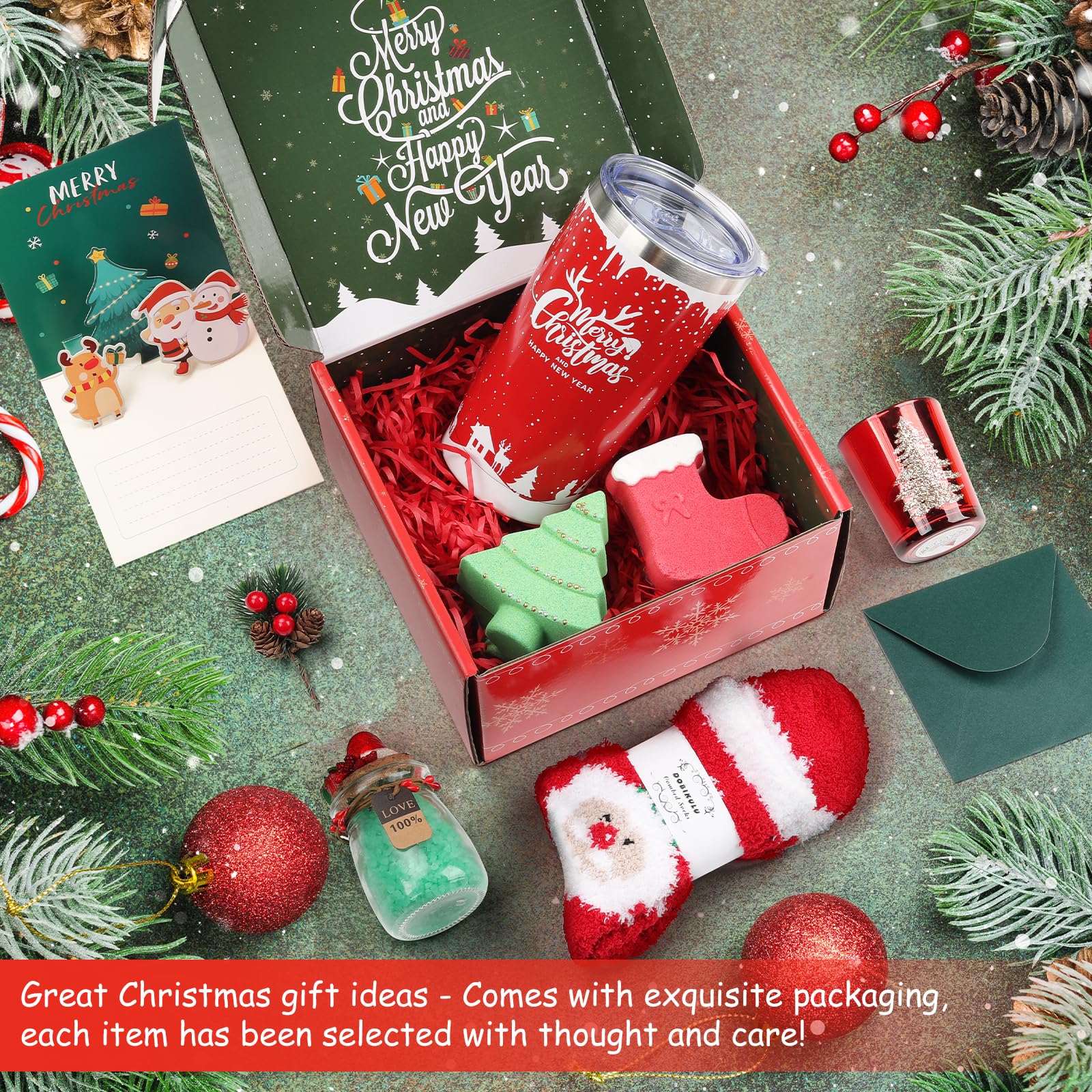 - 🎁🎁【Gifts for Women Who Have Everything】1 x 20oz insulated tumbler, 1 x scented candle, 1 x pine twig, 1 x 3D pop up Christmas card, 1 x bath salt, 2 x bath bombs, 1 x fuzzy Christmas socks, 1 x Christmas gift box. Every item in this Christmas gift package is carefully selected with high quality and Christmas elements, adding Christmas atmosphere. Great Valentines Day gifts for her, thinking of you gift, I love you gift, get well gifts for women, thank you gift, self care gift, best friend gift.