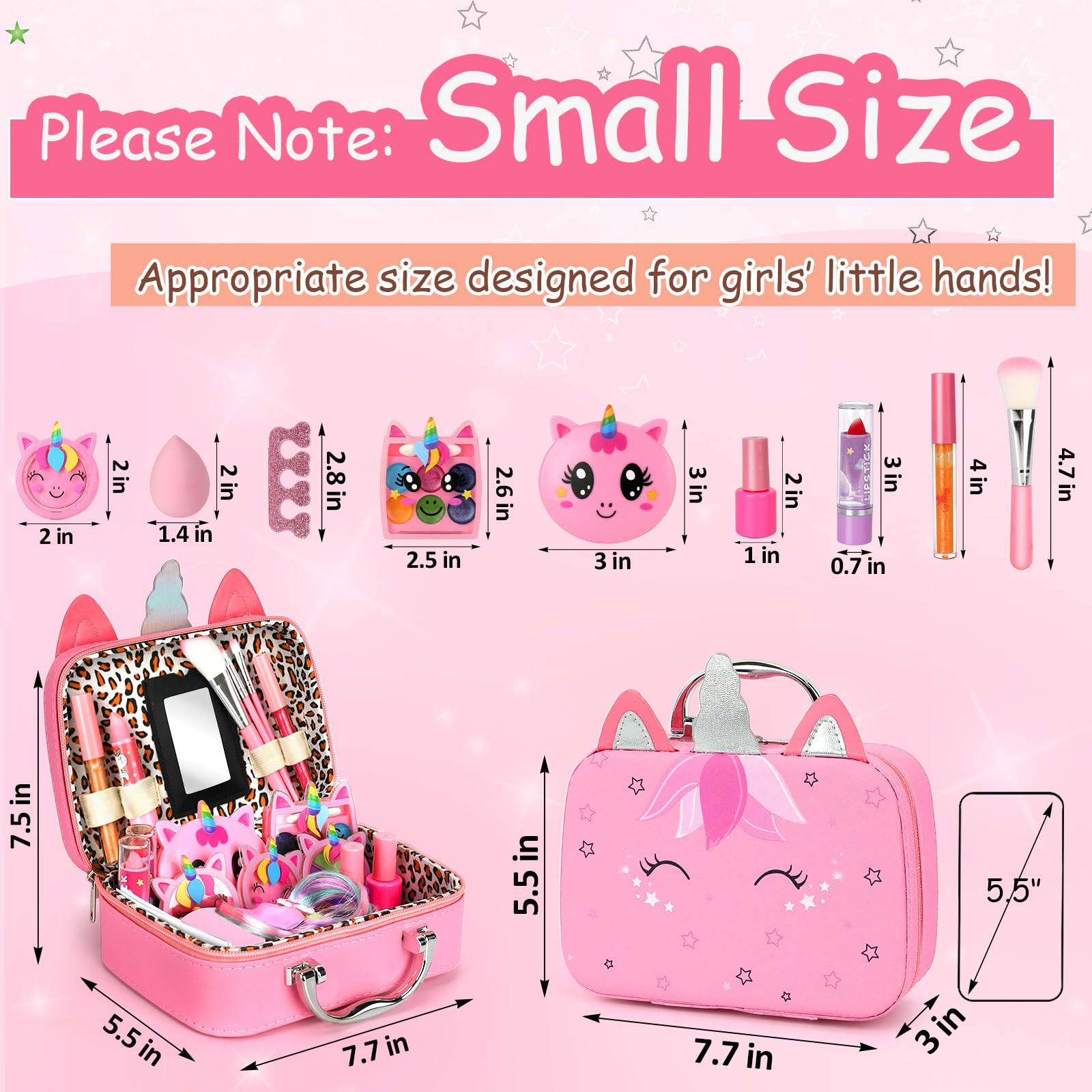 - TODDLERS MAKEUP TOY WITH KIDS MAKEUP CASE: Kids makeup case has a small mirror and a strap that can hold makeup brushes, just like a professional makeup case. The capacity is enough for little girls to organize all of her make up set which won’t make a mess everywhere. Little girls could conveniently carry her beloved makeup kit to everywhere as well. Mom don't worry about what gift to buy for the little girl, just buy Heaning kids makeup kit for girls