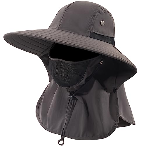 HEEHIPOO Mens Women Fishing Hat UPF 50+ Wide Brim Sun Hat with Face Cover & Neck Flap Dark Gray
