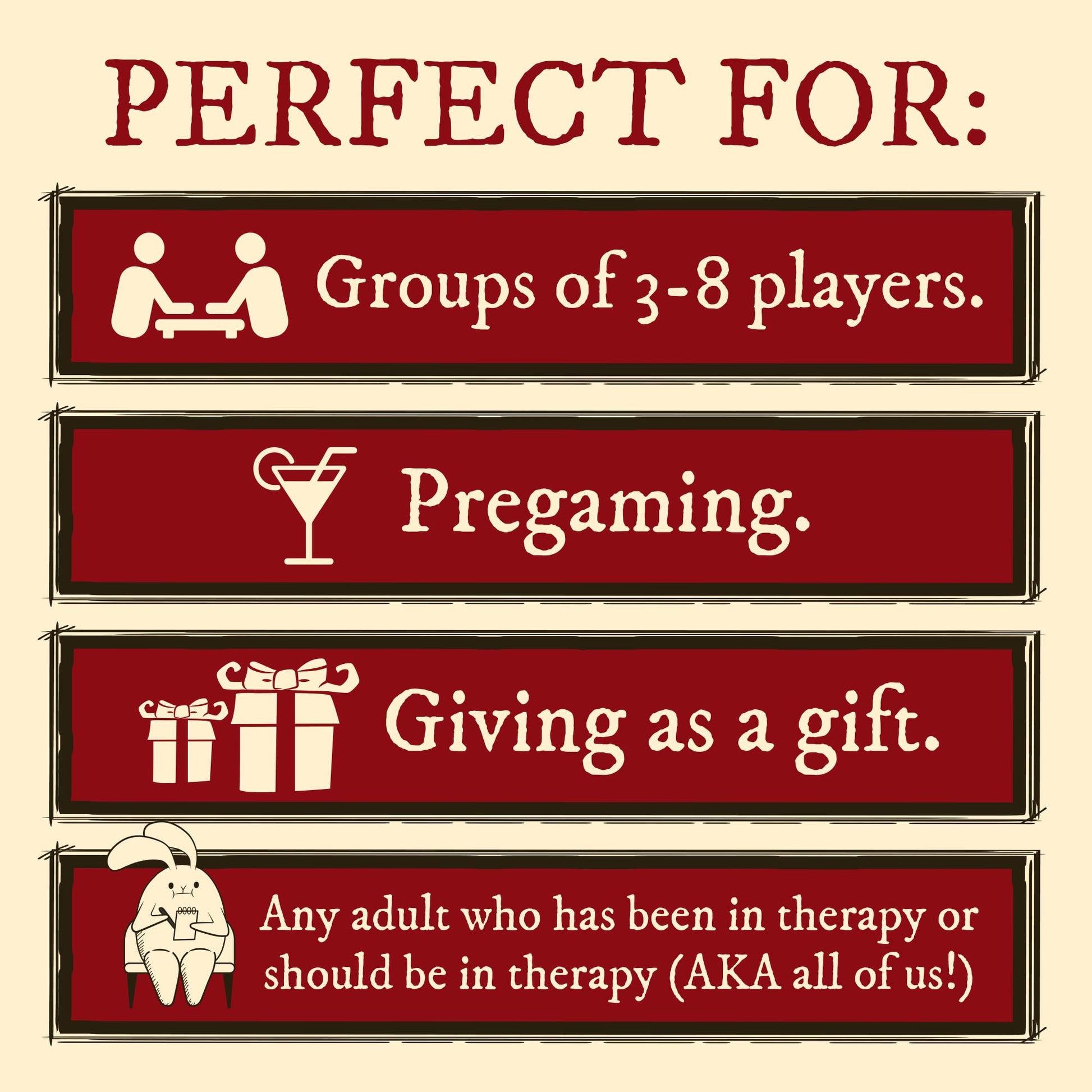 - Where to Play: WANT TO BREAK THE ICE AT PARTIES? This is a card game for adults that’s great for pregaming, large gatherings, road trips, vacations, or for giving as a gift to anyone who appreciates a funny card game (or who needs therapy!). Perfect for all adult party games and games for adults.