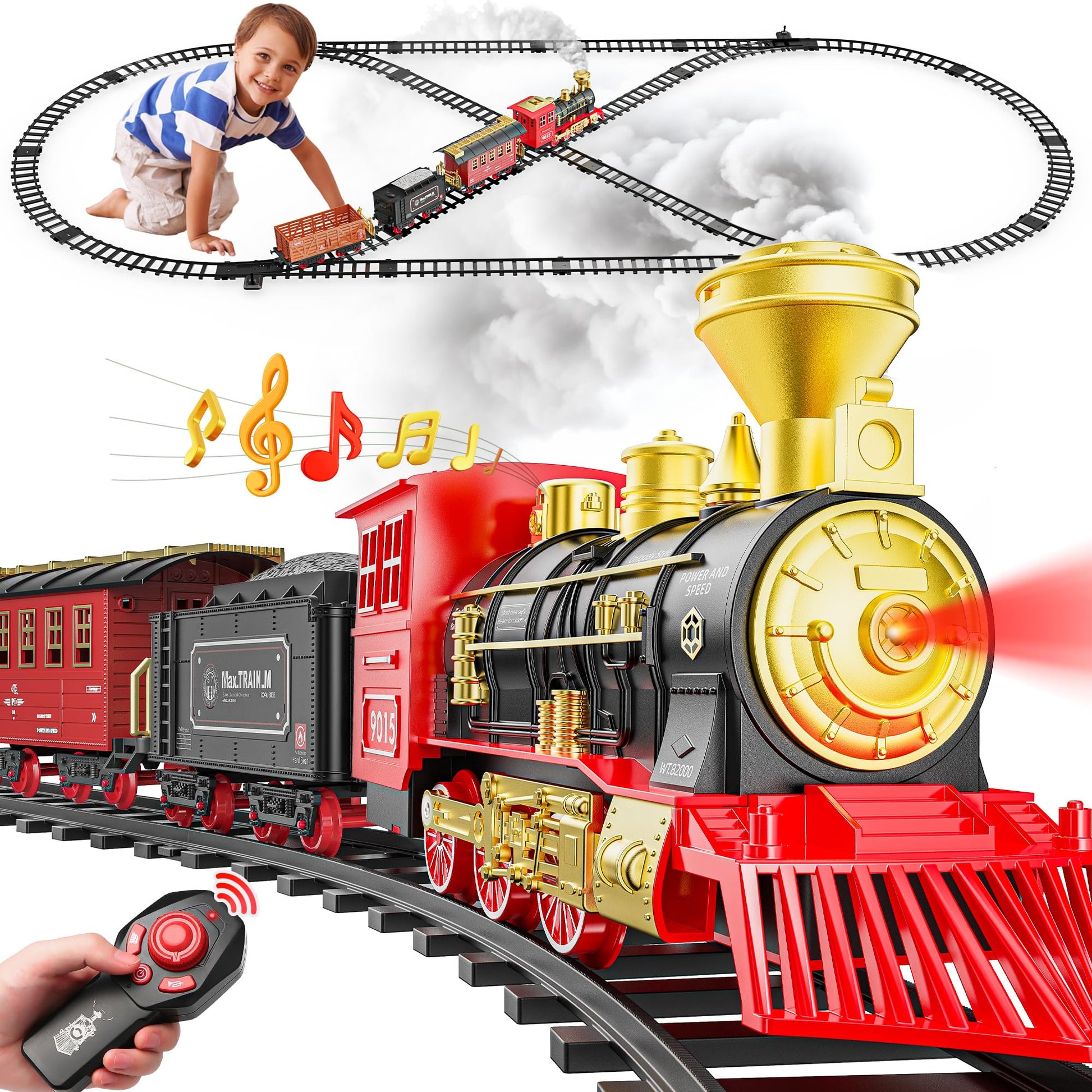 - [2025 VALUE CHRISTMAS TRAIN SET]: This Christmas tree train toys comes with a REMOTE CONTROLLER, a DELUXE TRACK SET (Including 8 curved tracks, 8 straight tracks, 4 Y-shaped tracks, 1 cross track), a steam locomotive, a passenger car, a coal car, and a cargo vehicle; This remote control train set for toddlers 2-4 is worth it and you don't need to buy extra tracks to enjoy more ways to play; A fully equipped toy train that allows your children to play for hours and brings more joy to your family; The track width for this boys train set is: 6cm (2.36in)
