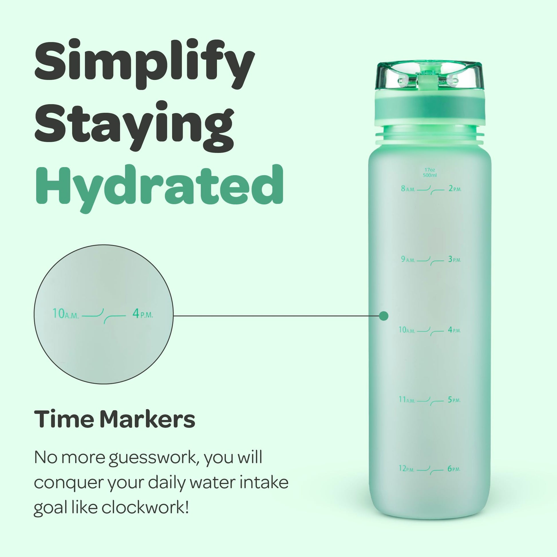 - đź•’WATER BOTTLE WITH TIME MARKER A quick glance at the intuitive timeline will tell you when to take your next sip throughout the day. No more guesswork, you will conquer your daily water intake goal like clockwork!
