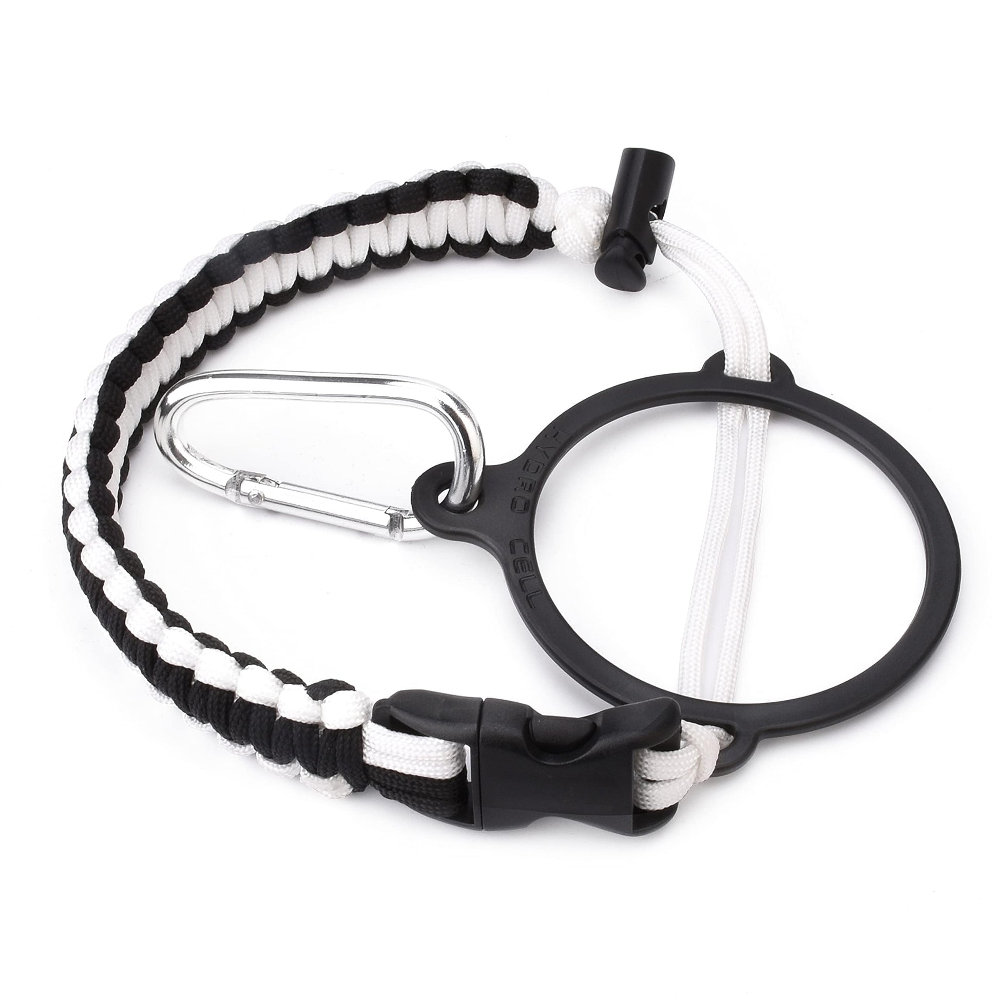 HYDRO CELL Paracord Handle for Wide Mouth Water Bottles - Carrier Strap w/Attachment Ring and Carabiner Accessory. Compatible w/ 64oz, 40oz 32oz, 24oz, 18oz, 14oz Insulated Bottles (Black/White)