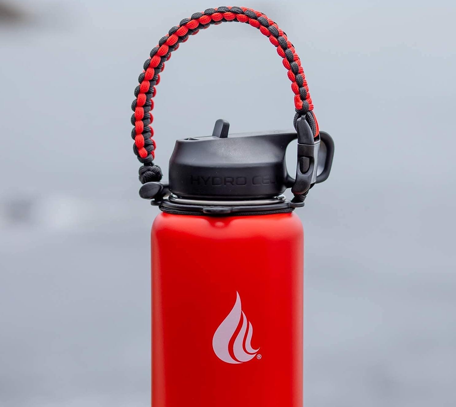 HYDRO CELL Paracord Handle for Wide Mouth Water Bottles - Carrier Strap w/Attachment Ring and Carabiner Accessory. Compatible w/ 64oz, 40oz 32oz, 24oz, 18oz, 14oz Insulated Bottles (Red/Black)