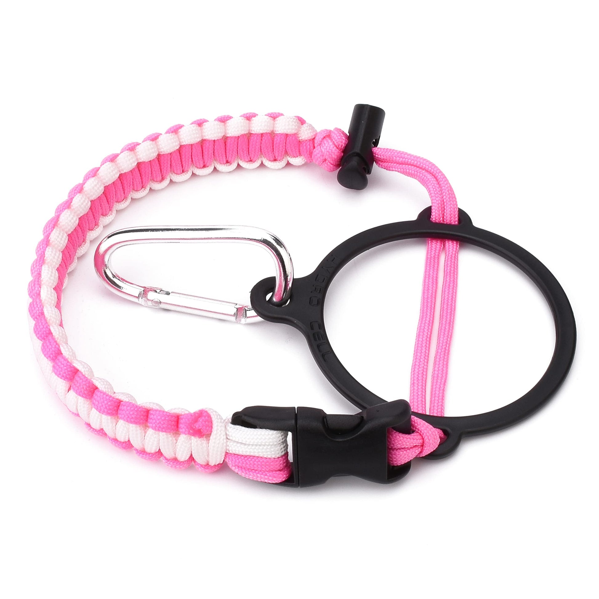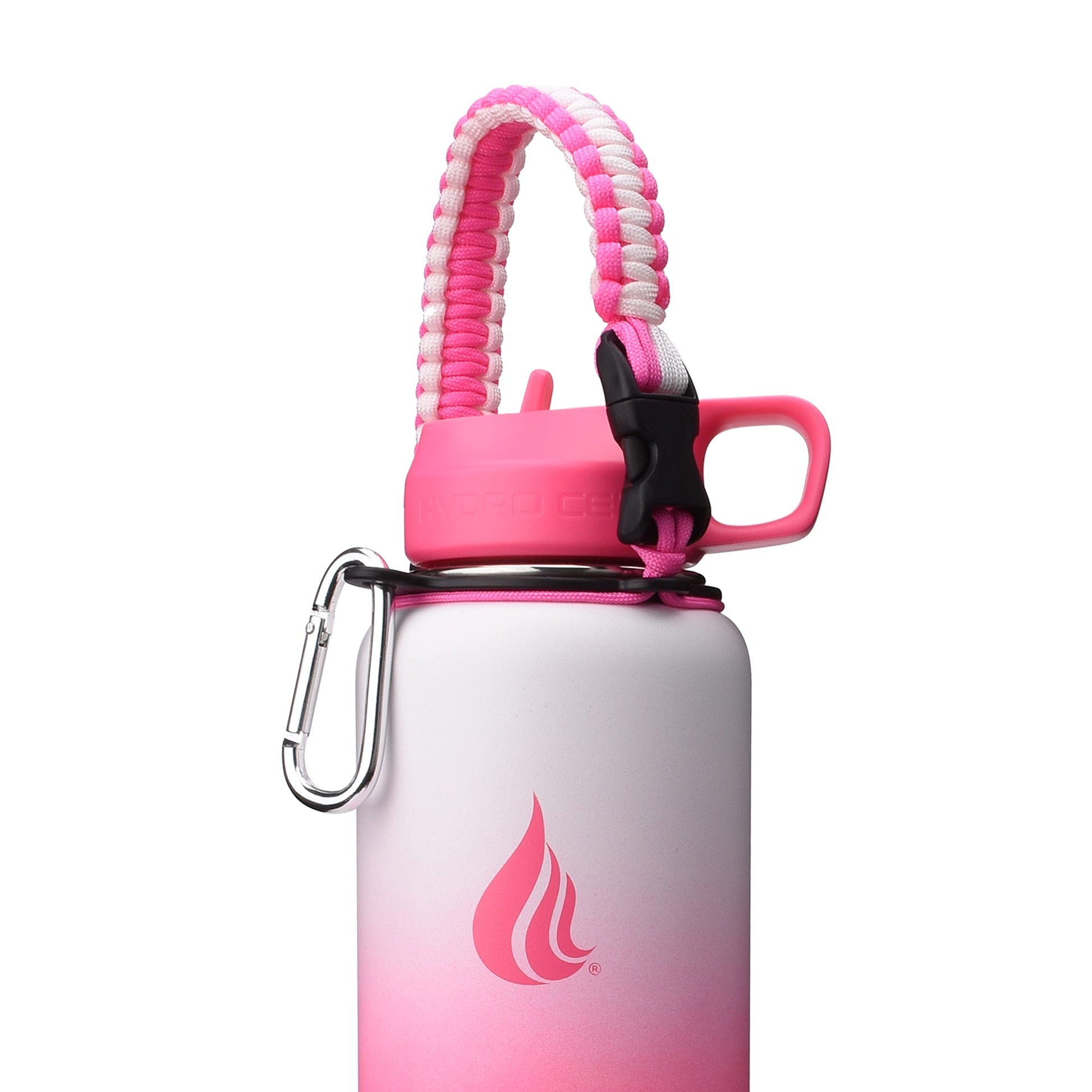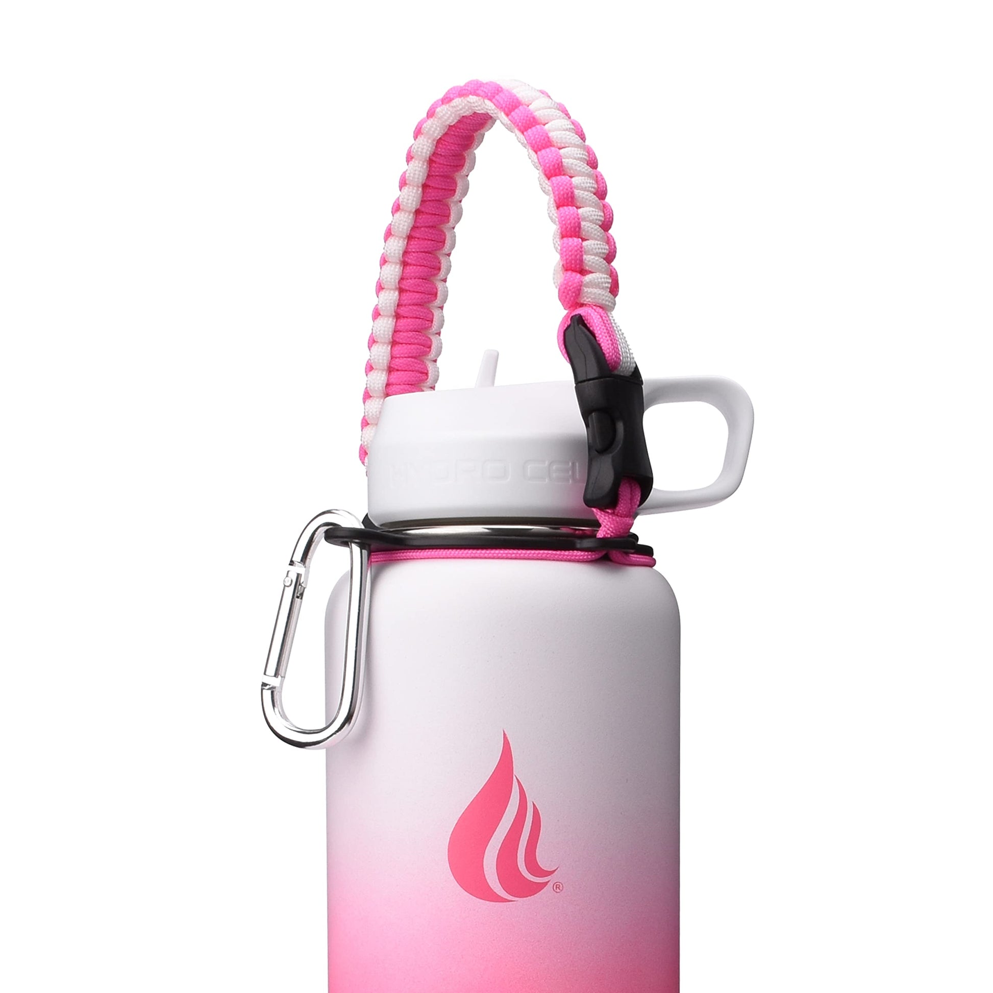 HYDRO CELL Paracord Handle for Wide Mouth Water Bottles - Carrier Strap w/Attachment Ring and Carabiner Accessory. Compatible w/ 64oz, 40oz 32oz, 24oz, 18oz, 14oz Insulated Bottles (White/Pink)