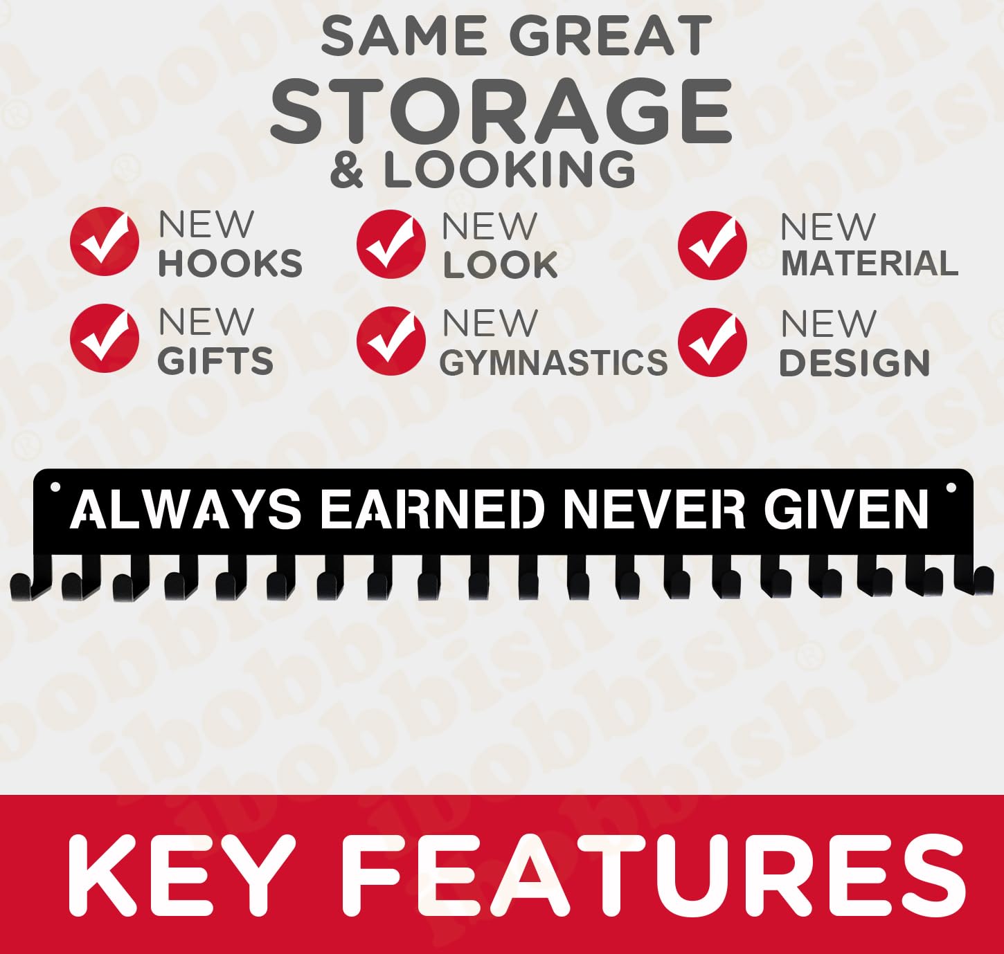 iBobbish Premium Medal Holder Hanger Display for wall ALWAYS EARNED NEVER GIVEN with 20 Hooks,race medal display Upgraded Medal Holder display with Simple Design for gymanstics,race,soccer,swim