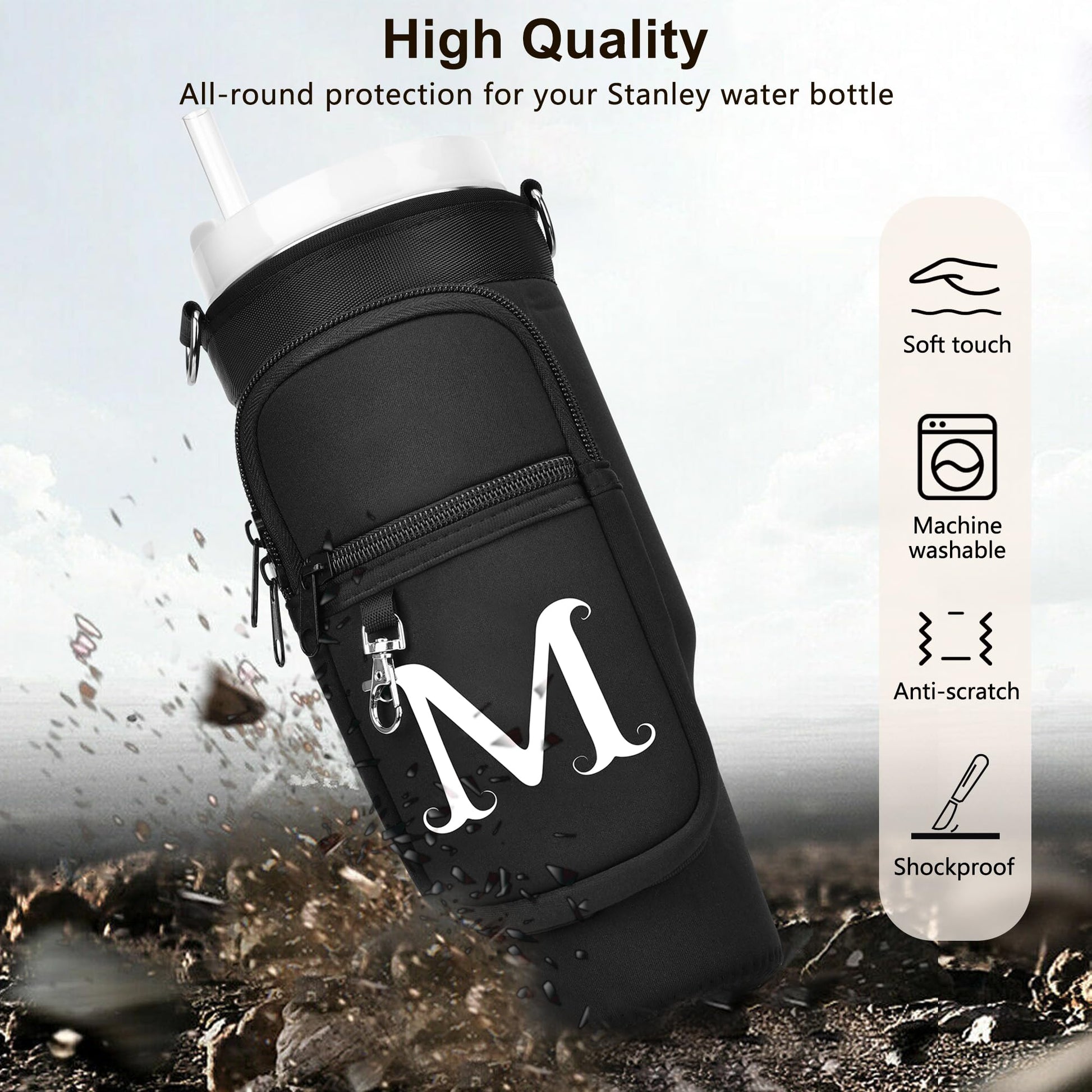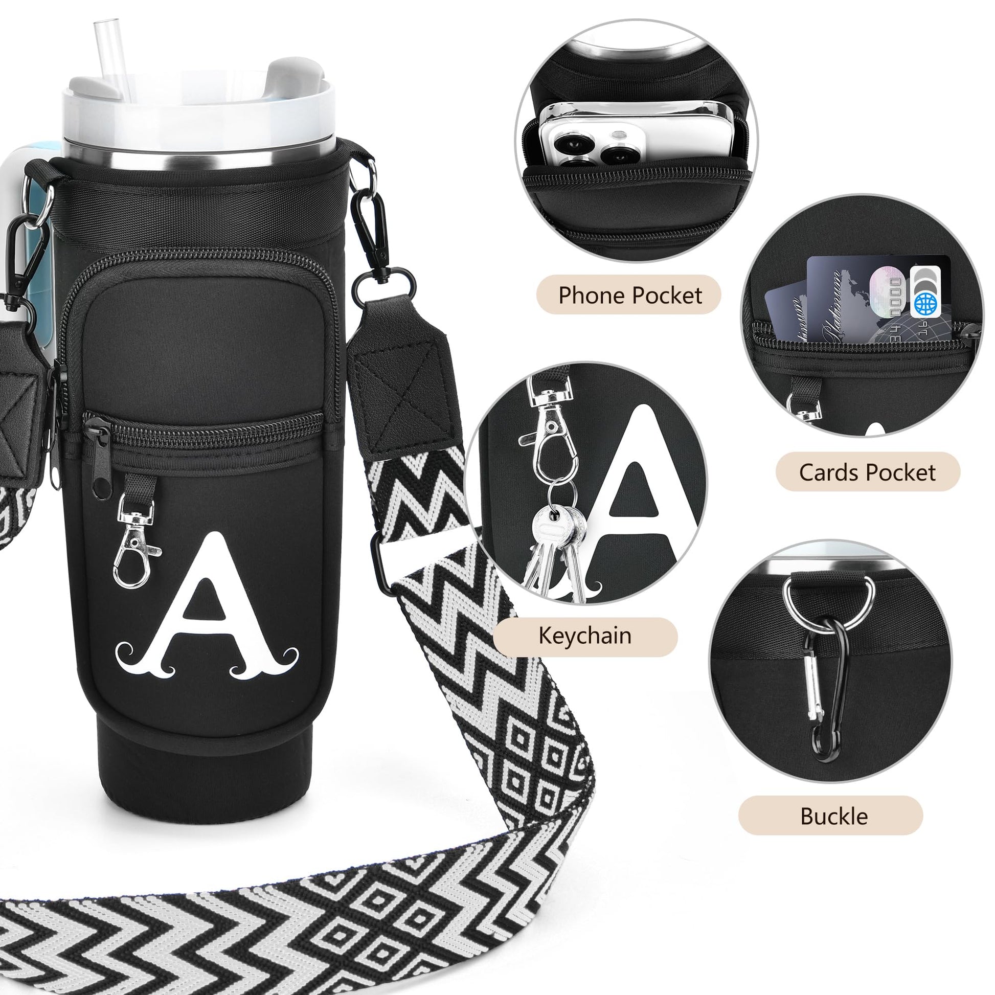 Initial Water Bottle Holder with Strap for Stanley 40 oz Tumbler, for Simple Modern 40 oz Tumbler, Graduation Gift with Phone Pocket, Carabiner, Personalized Gift for Stanley Cup Accessories Black A