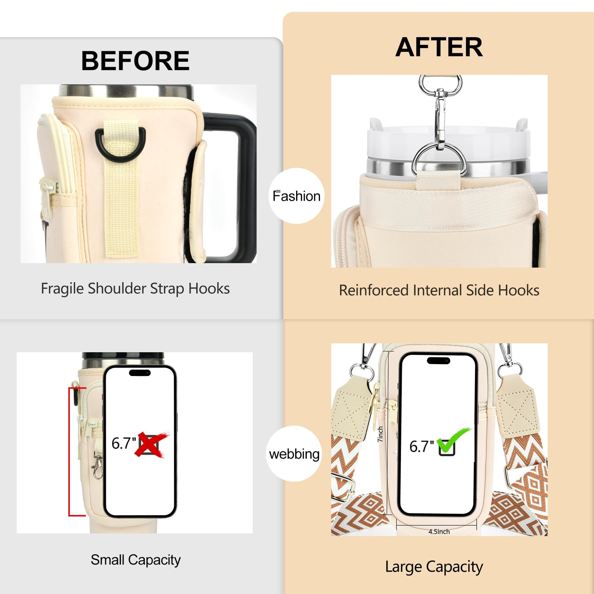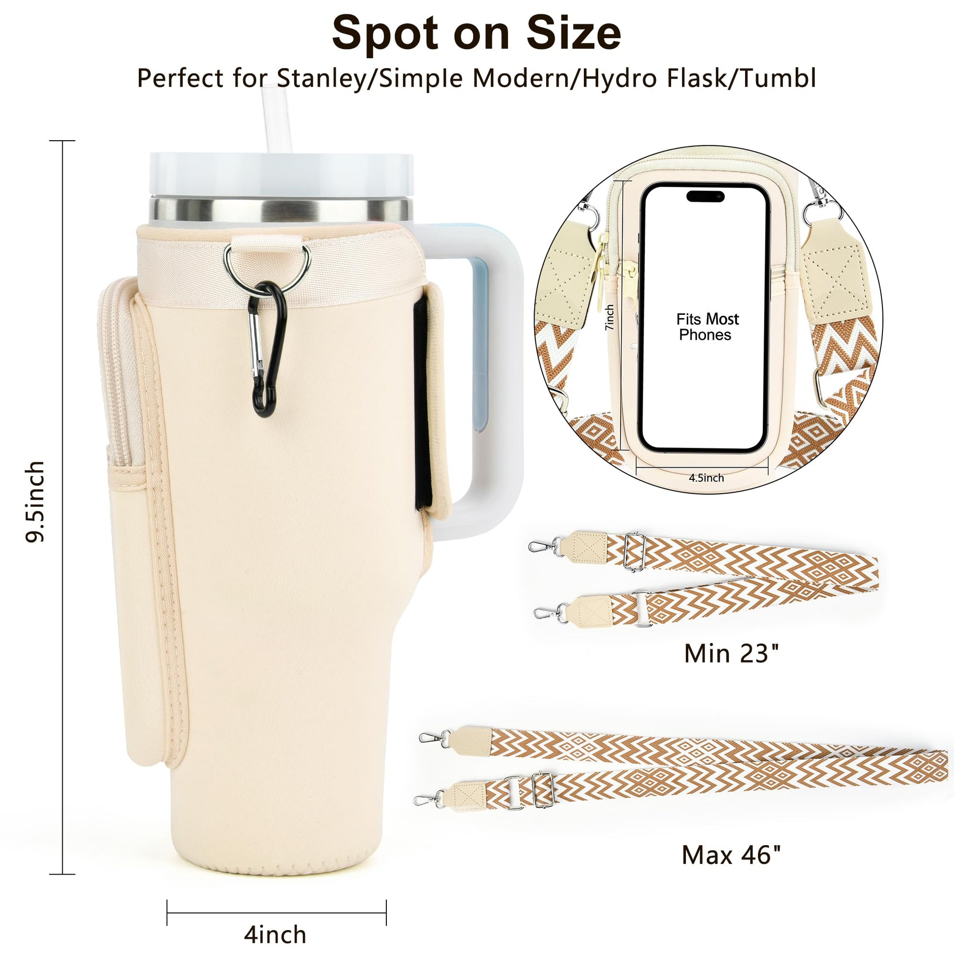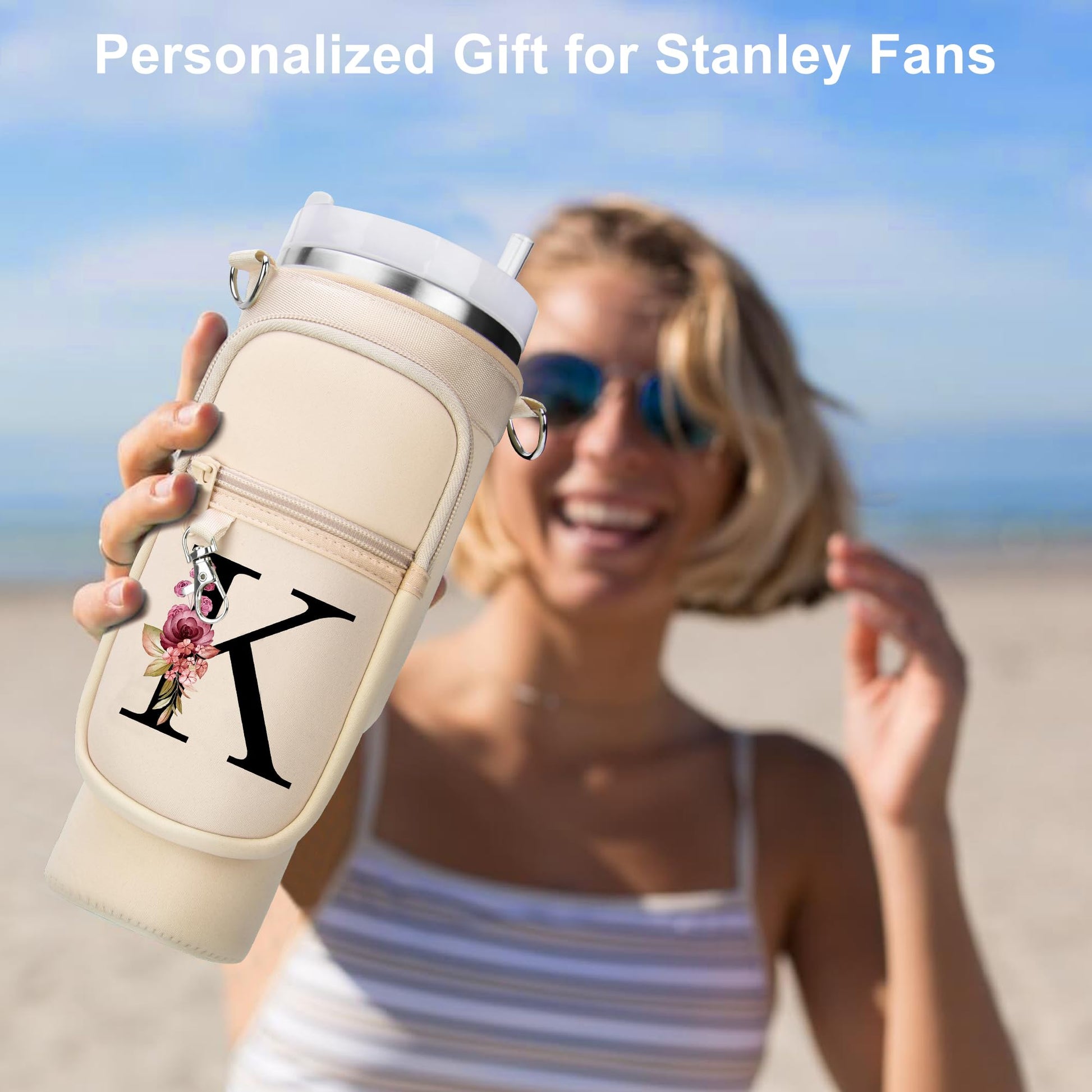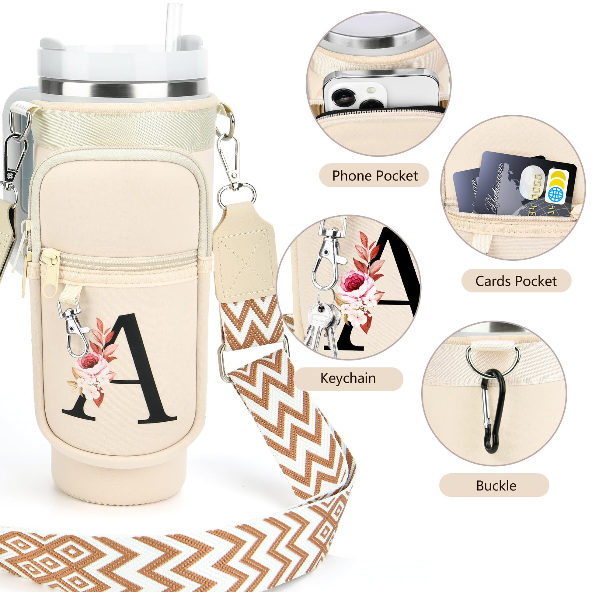 Initial Water Bottle Holder with Strap for Stanley 40 oz Tumbler, for Simple Modern 40 oz Tumbler, Graduation Gift with Phone Pocket, Carabiner, Personalized Gift for Stanley Cup Accessories Cream A