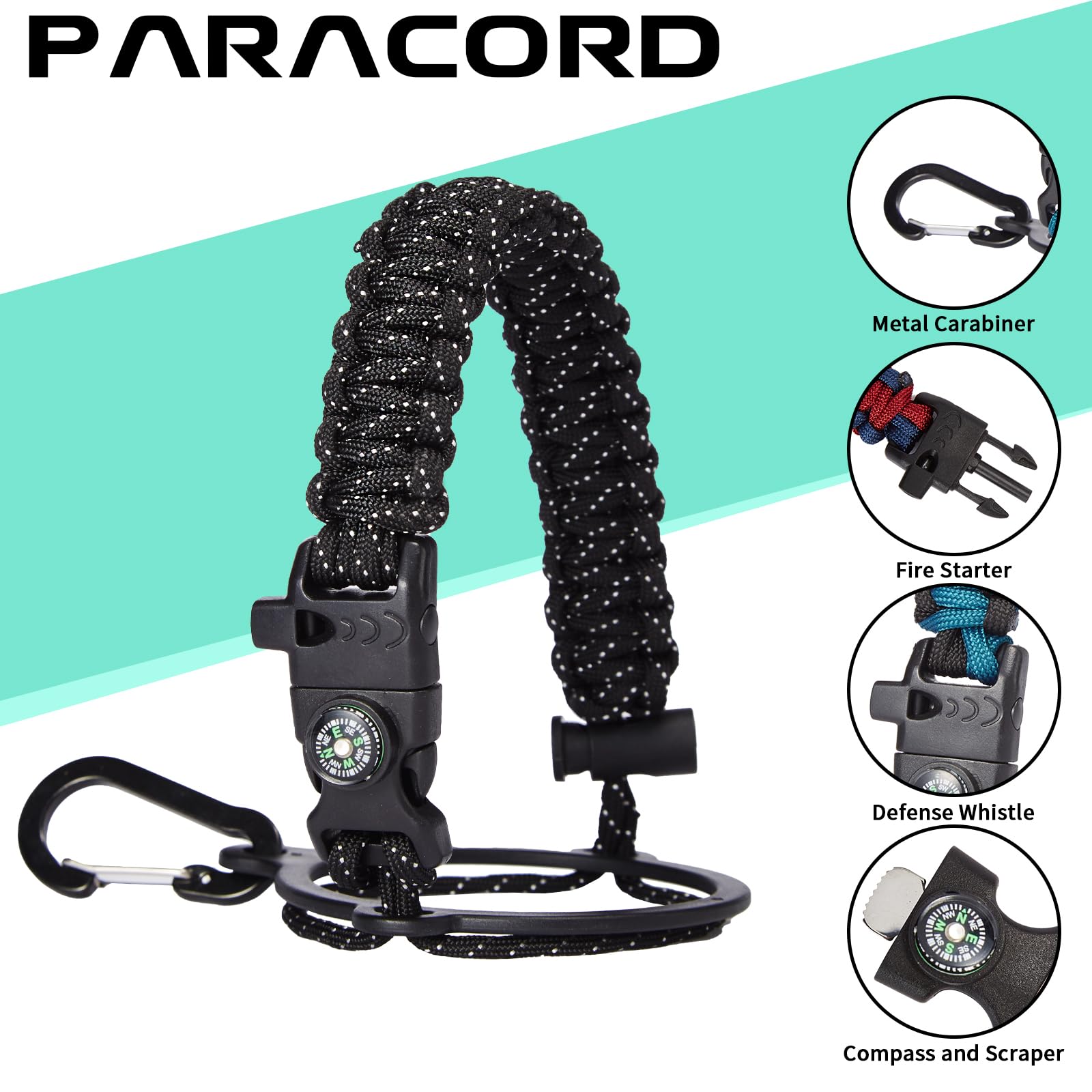- UNIQUE PARACORD HANDLE: Bright color paracord matches the flask water bottle to give you a youthful vibe while adding a personal style. With a compass, safety loop, metal carabiner, flint, igniter and whistle to become your survival tool, making the 32 oz metal water bottle with paracord an ideal survival kit for expeditions in the wild