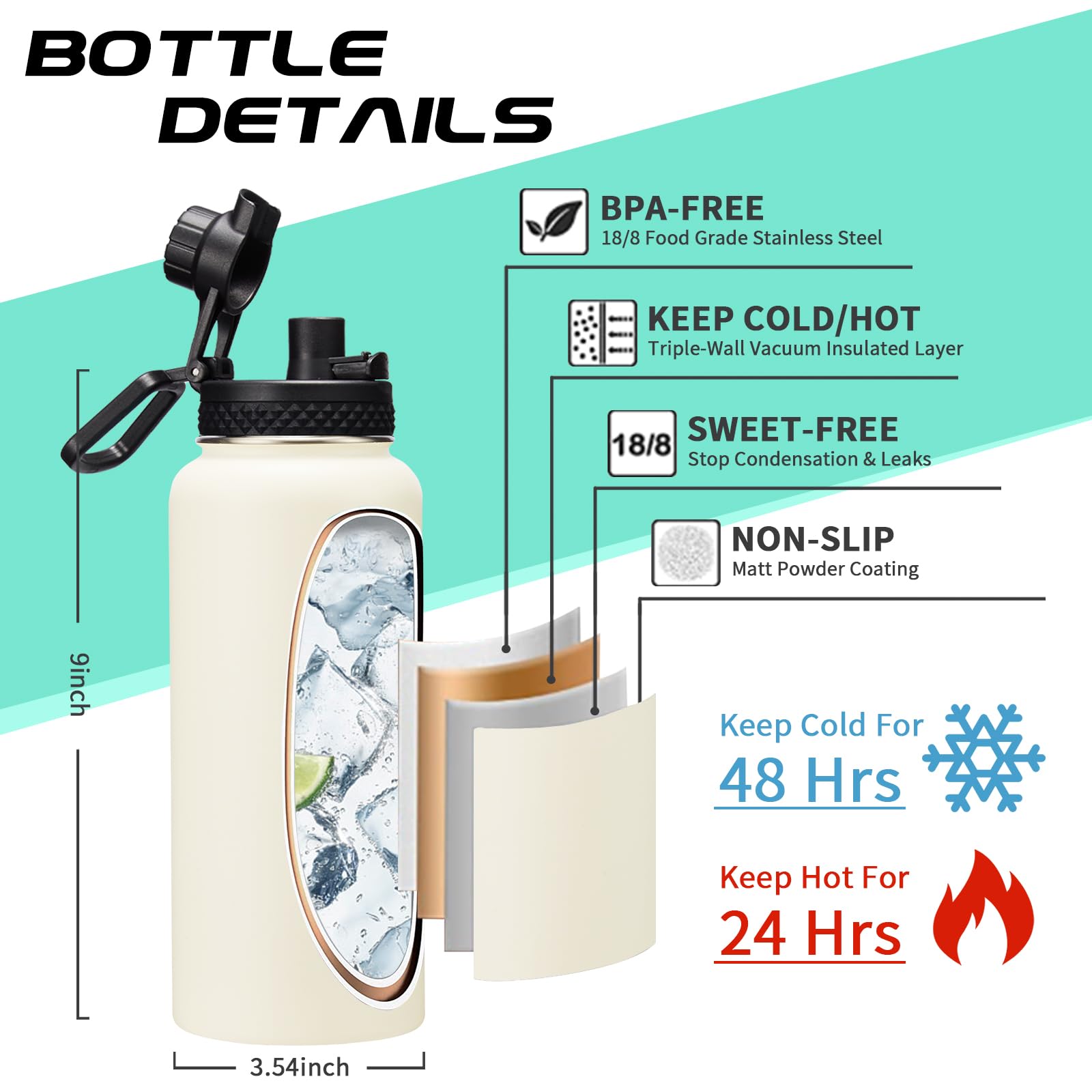 - QUALITY VACUUM INSULATION: Metal water bottle featuring double-wall & food-grade 18/8 stainless steel with superior insulation & anti-condensation, keeping your beverages stay ICE COLD for 48-Hours & HOT for 24-Hours for a fresh taste. In addition, the outer layer with non-slip powder coating ensures drinking bottles won't sweat & that keeps it from slipping