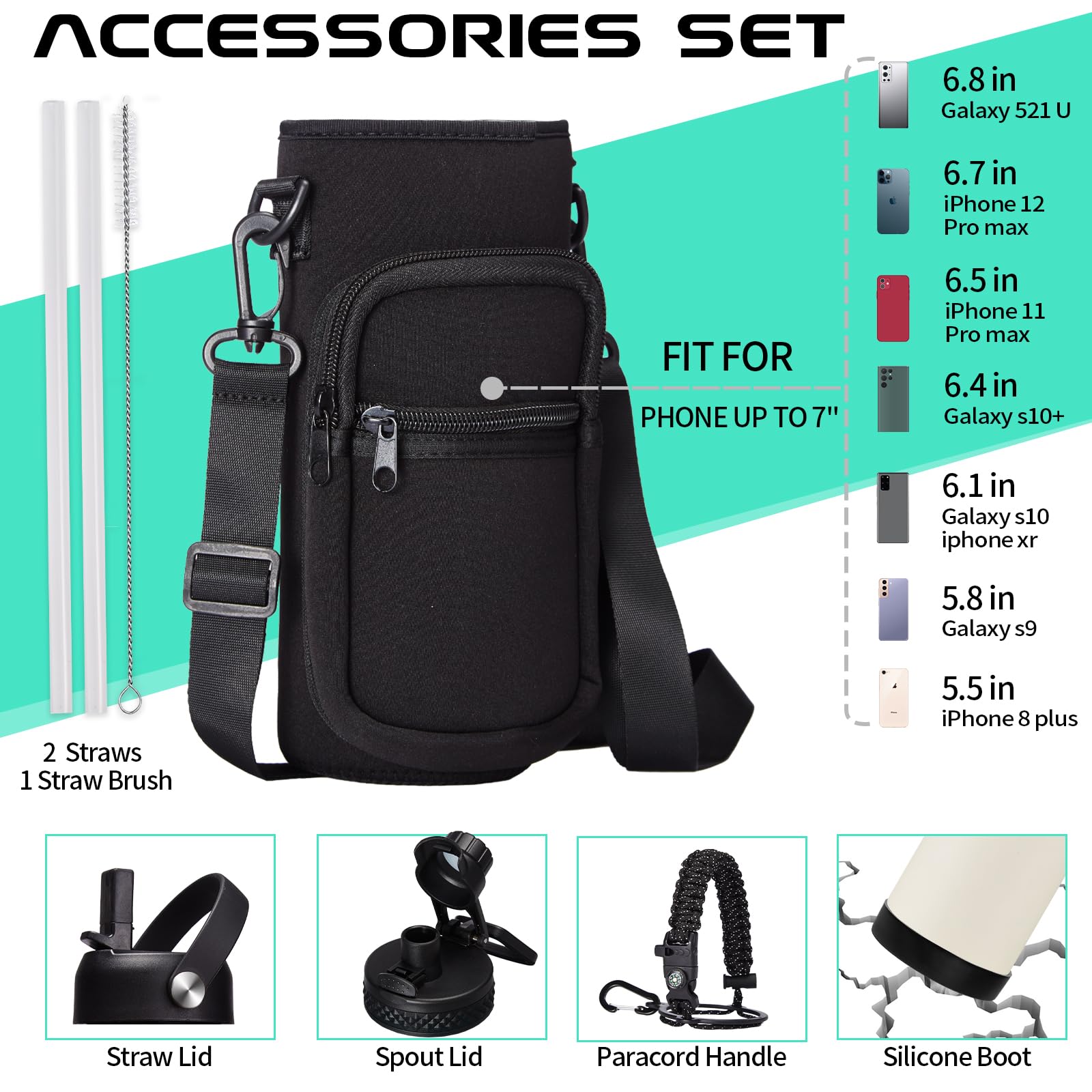 - SUPER JOYFUL COMBO: Buy insulated water bottle 32 oz and get 9 accessories (2 x lids, 1 x survival paracord, 1 x carrying pouch, 1 x shoulder strap, 1 x protective cup mat, 2 x straws, 1 x straw brush). WITH A LIFETIME GUARANTEE, these thermal water bottles are perfect gifts for using at home, work, school, road trips, hiking, sporting events, or just hanging out