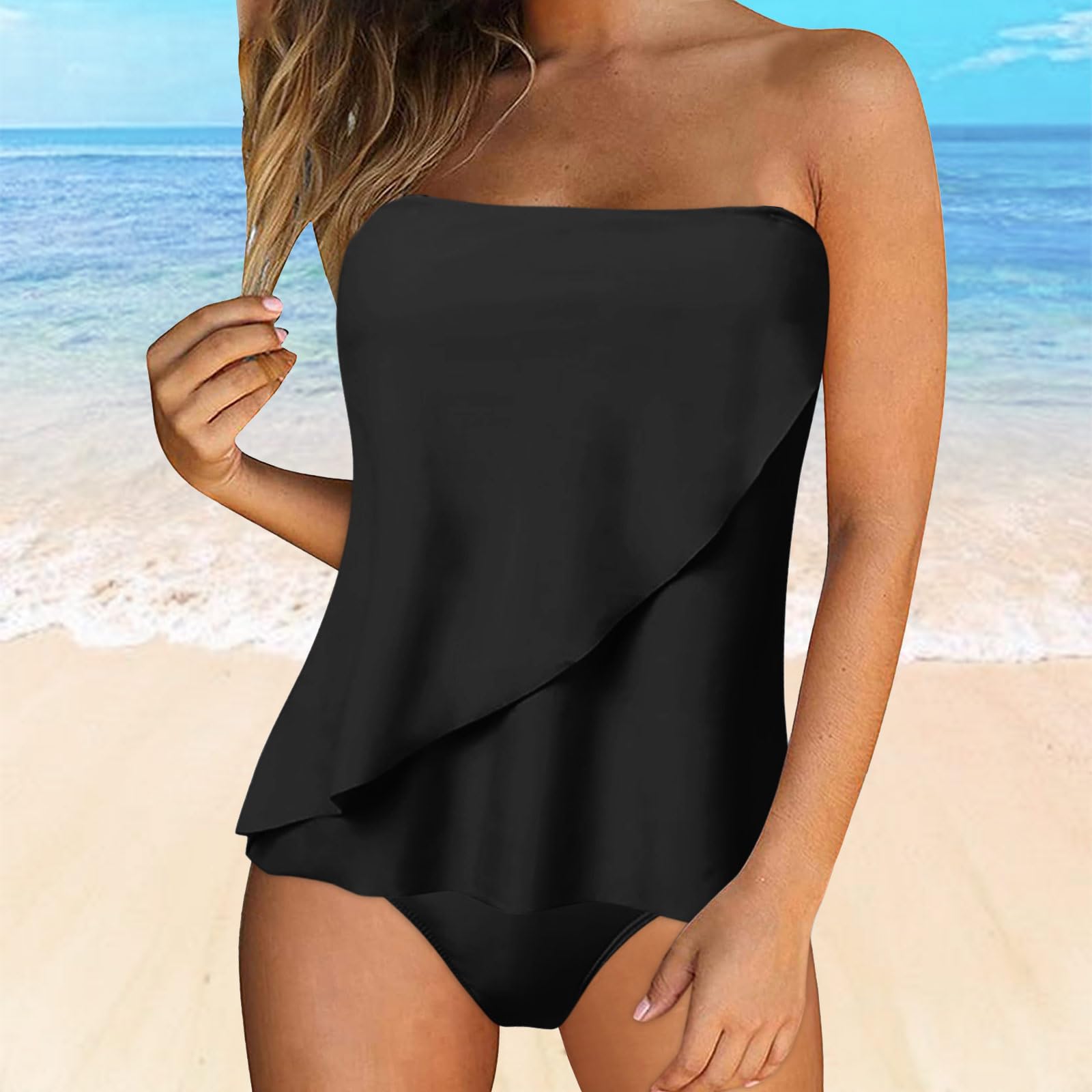 JEUROT 2 Piece Bandeau Swimsuits for Women Strapless Bathing Suits Tummy Control Flowy Swimwear with High Waisted Bottom Swim Suits 2024 Beach Vacation Outfits (Black, XXL)