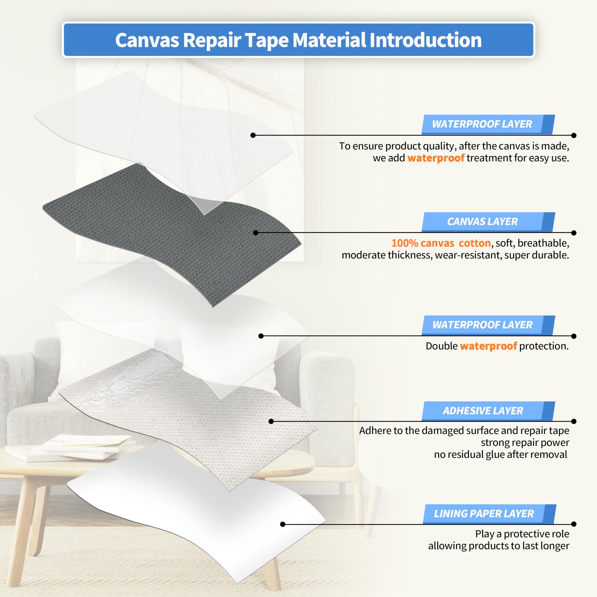 - Waterproof Cotton Canvas: The self-adhesive canvas outdoor repair tape is made of high-density canvas material that is wear-resistant and scratch-resistant. The fabric surface is coated with a waterproof layer, providing excellent resistance to water penetration, making it suitable for outdoor use. The patch has a thickness of 1.2mm, which is moderate and flexible, allowing it to blend well with outdoor equipment such as umbrellas and tents, and can last for an long period.