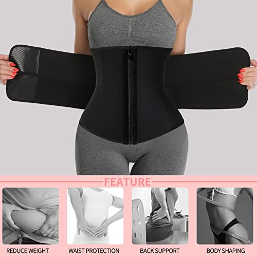 KIWI RATA Neoprene Sauna Waist Trainer Corset Sweat Belt with 2 Straps for Women Double Compression Workout Cincher Back Support Fajas,#2 Zipper Black,Small
