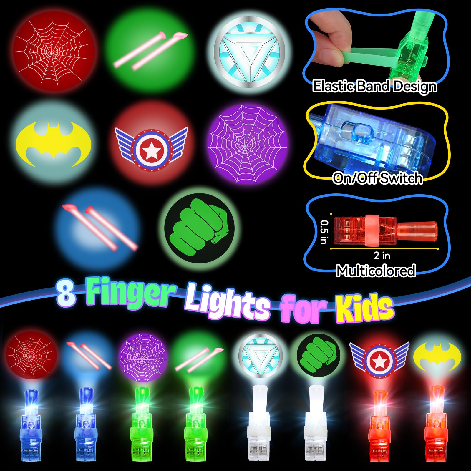- UNIQUE SUPERHERO MASKS AND FINGER LIGHTS --- Cool hero masks with elasticized elastic bands and unique animated graphic designs. Comfortable fit for all boys and girls. Each hero set comes with 1 finger light. It can project the corresponding character hero skills and won't hurt your child's eyes. Toddler kids hero masks and finger lights have no sharp edges and won't hurt your child's little hands. Great for Halloween fun in addition to the usual dress up and cosplay parties