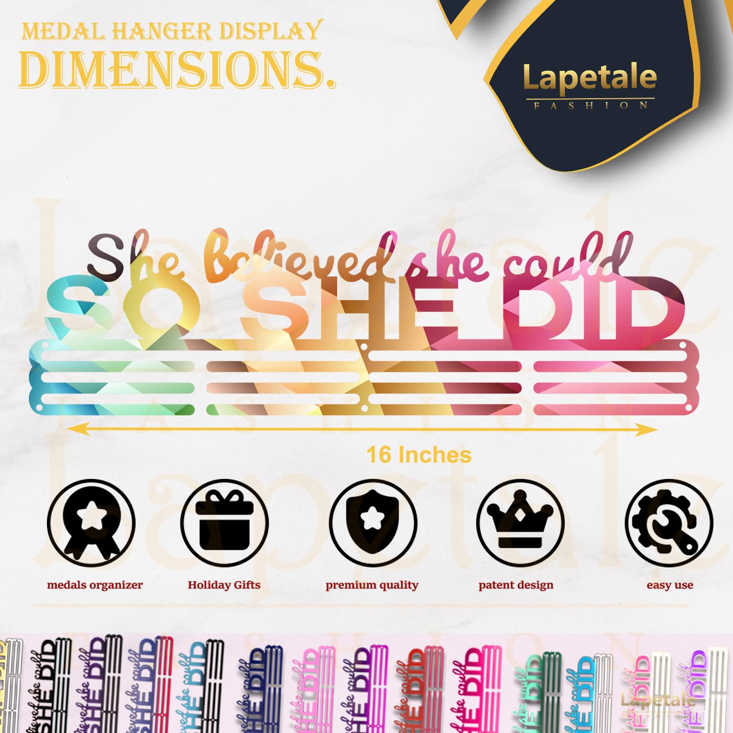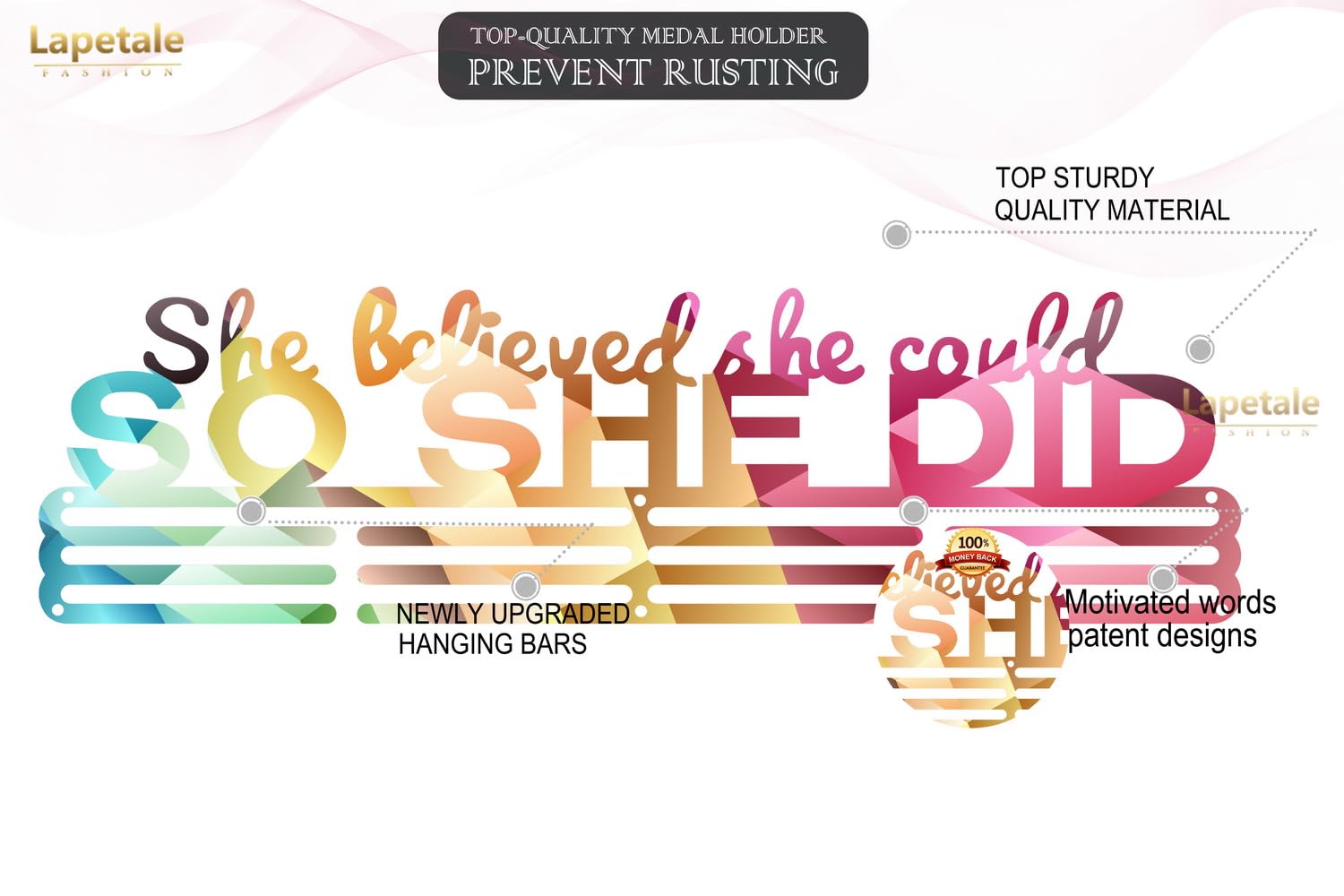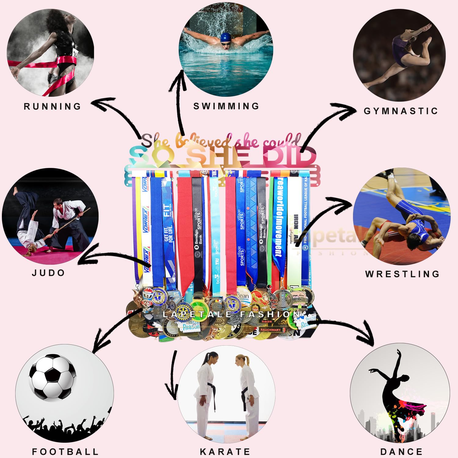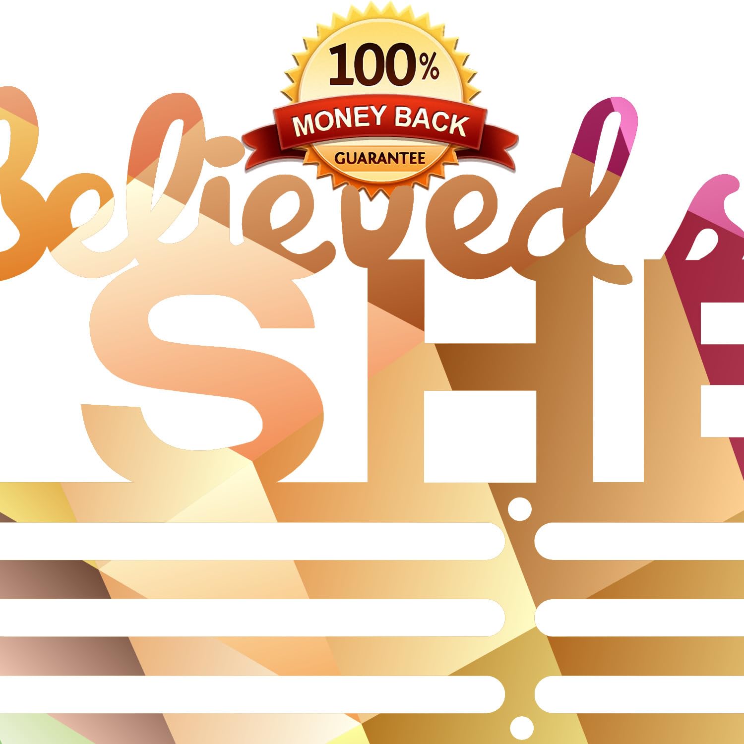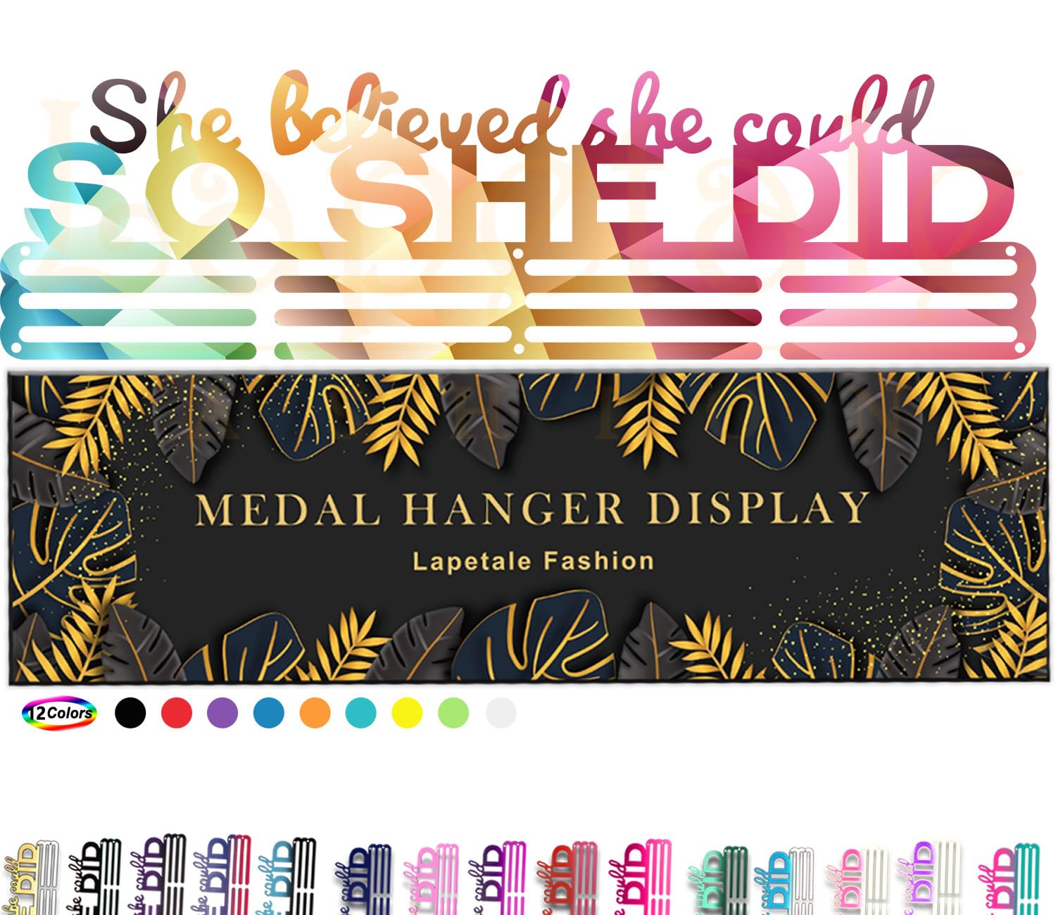 - 【STYLISH MEDAL HOLDER FOR SPORTS】runner medal hanger display design of this display wall mounted is not only a esthetic home decoration but also a great gift for your family or friends. sports medal hanger display won't go missing or collect dust in a drawer or closet; The 'She Believed She Could SO SHE DID ' medal display motivates you to keep pushing your limits and strive for greatness.The size of the metal hanger display: 16 inches long