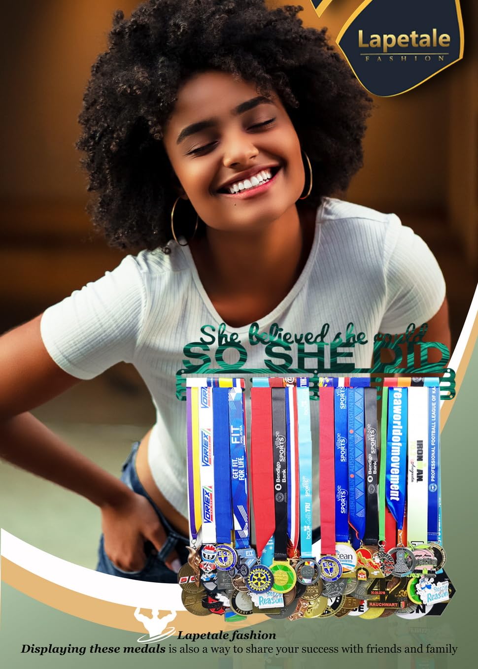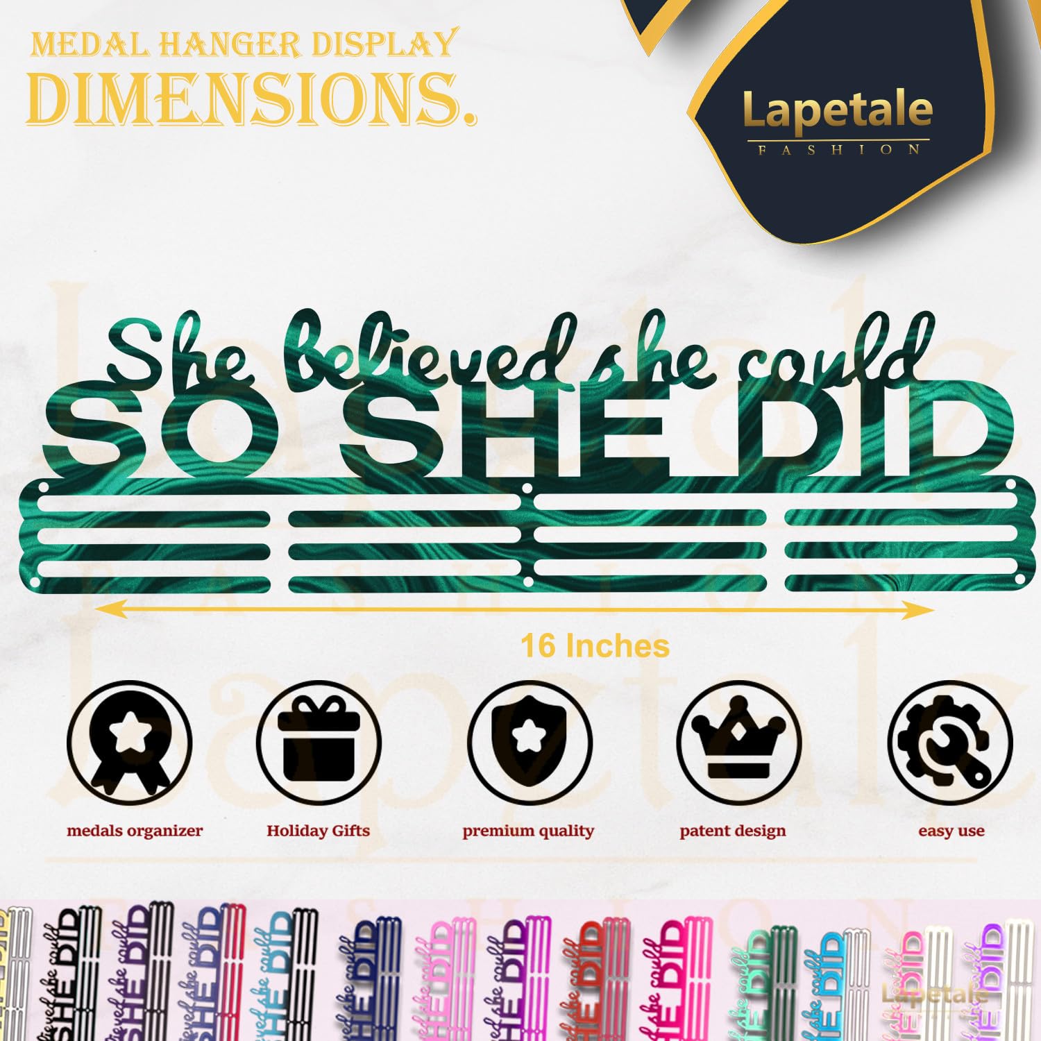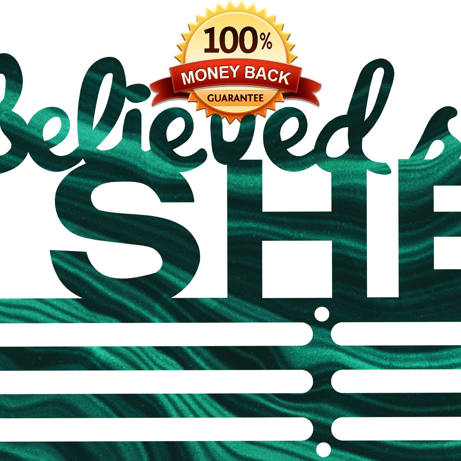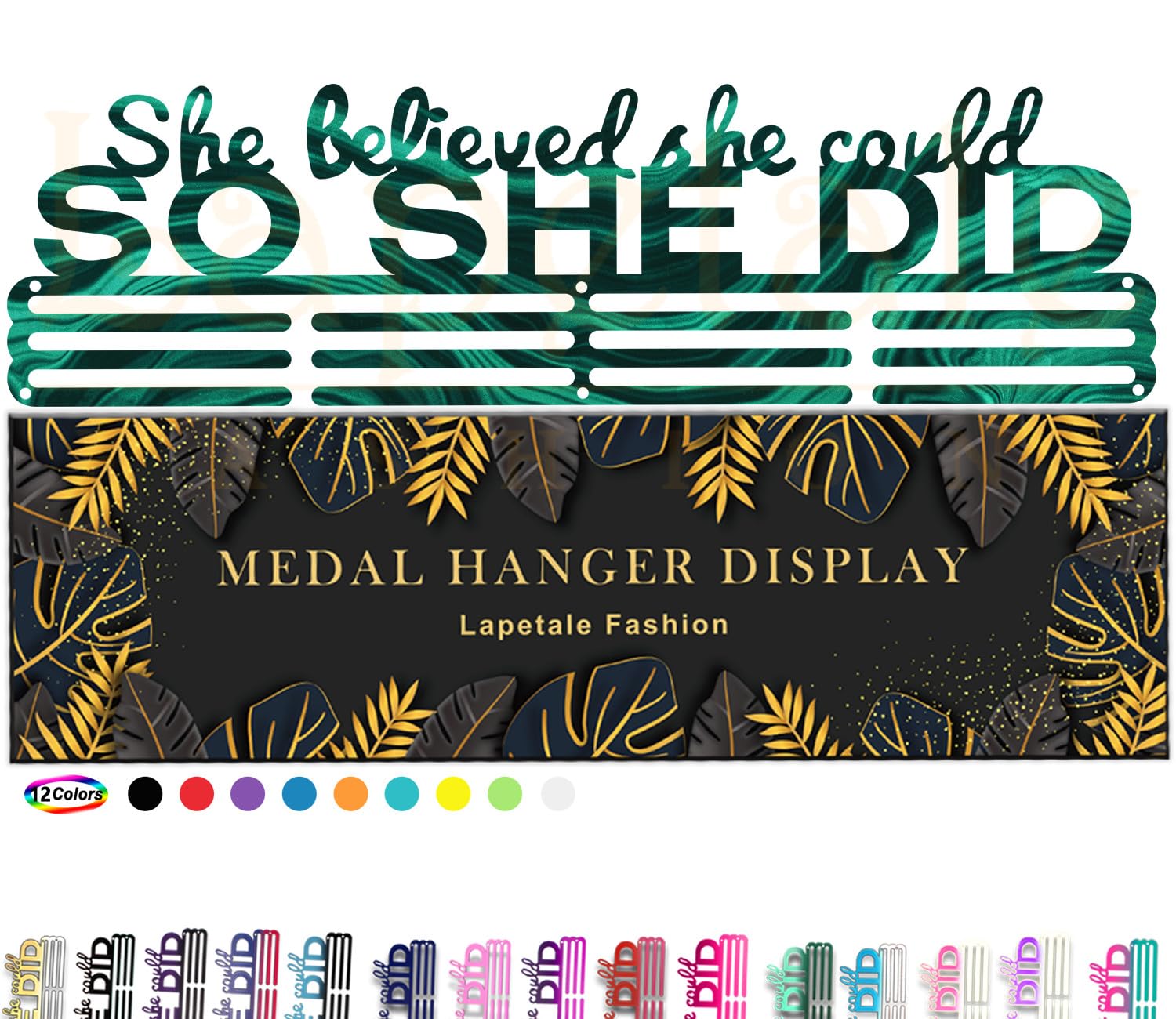 - 【STYLISH MEDAL HOLDER FOR SPORTS】runner medal hanger display design of this display wall mounted is not only a esthetic home decoration but also a great gift for your family or friends. sports medal hanger display won't go missing or collect dust in a drawer or closet; The 'She Believed She Could SO SHE DID ' medal display motivates you to keep pushing your limits and strive for greatness.The size of the metal hanger display: 16 inches long