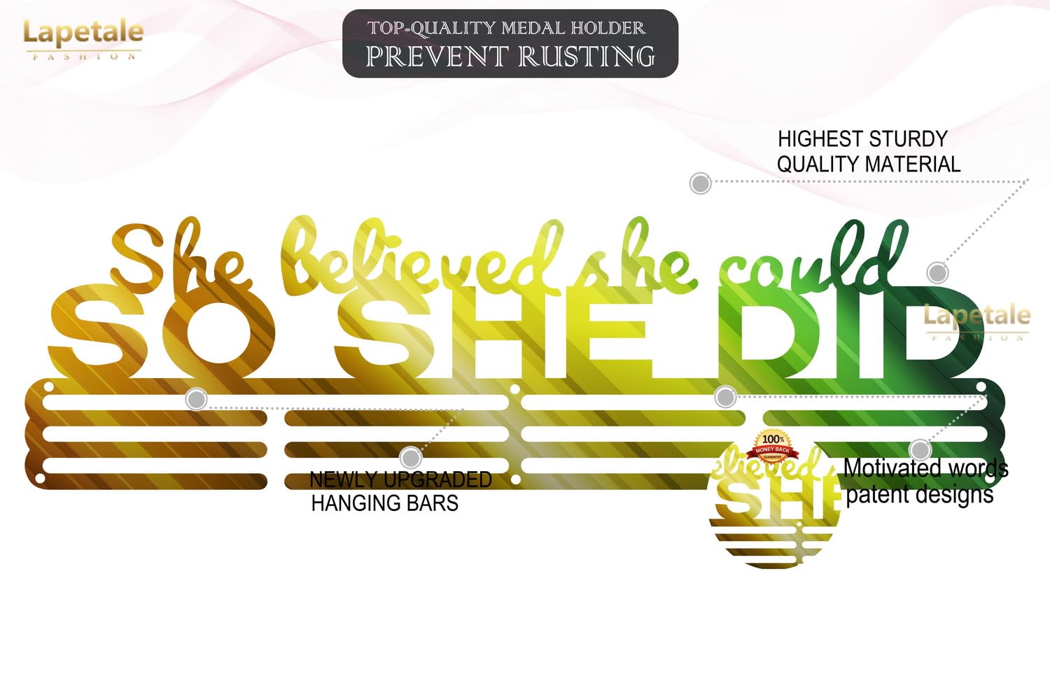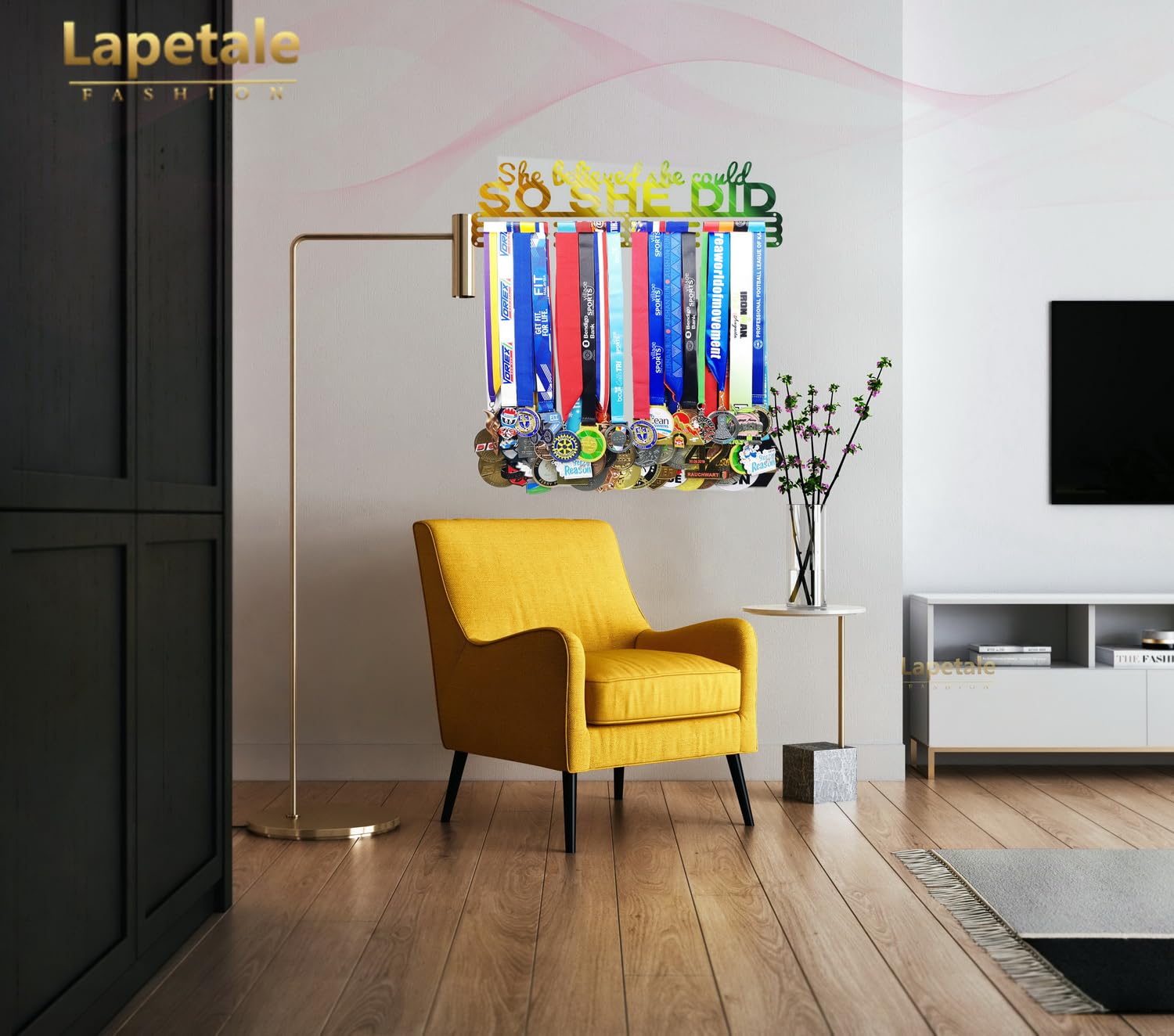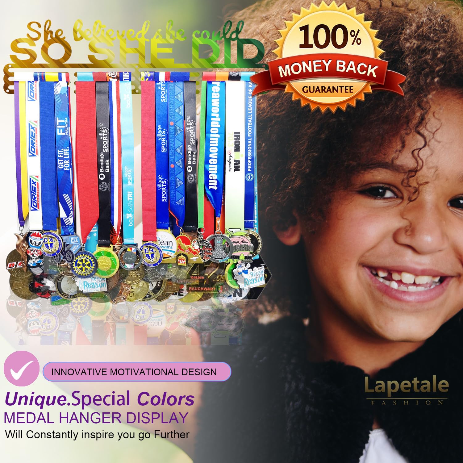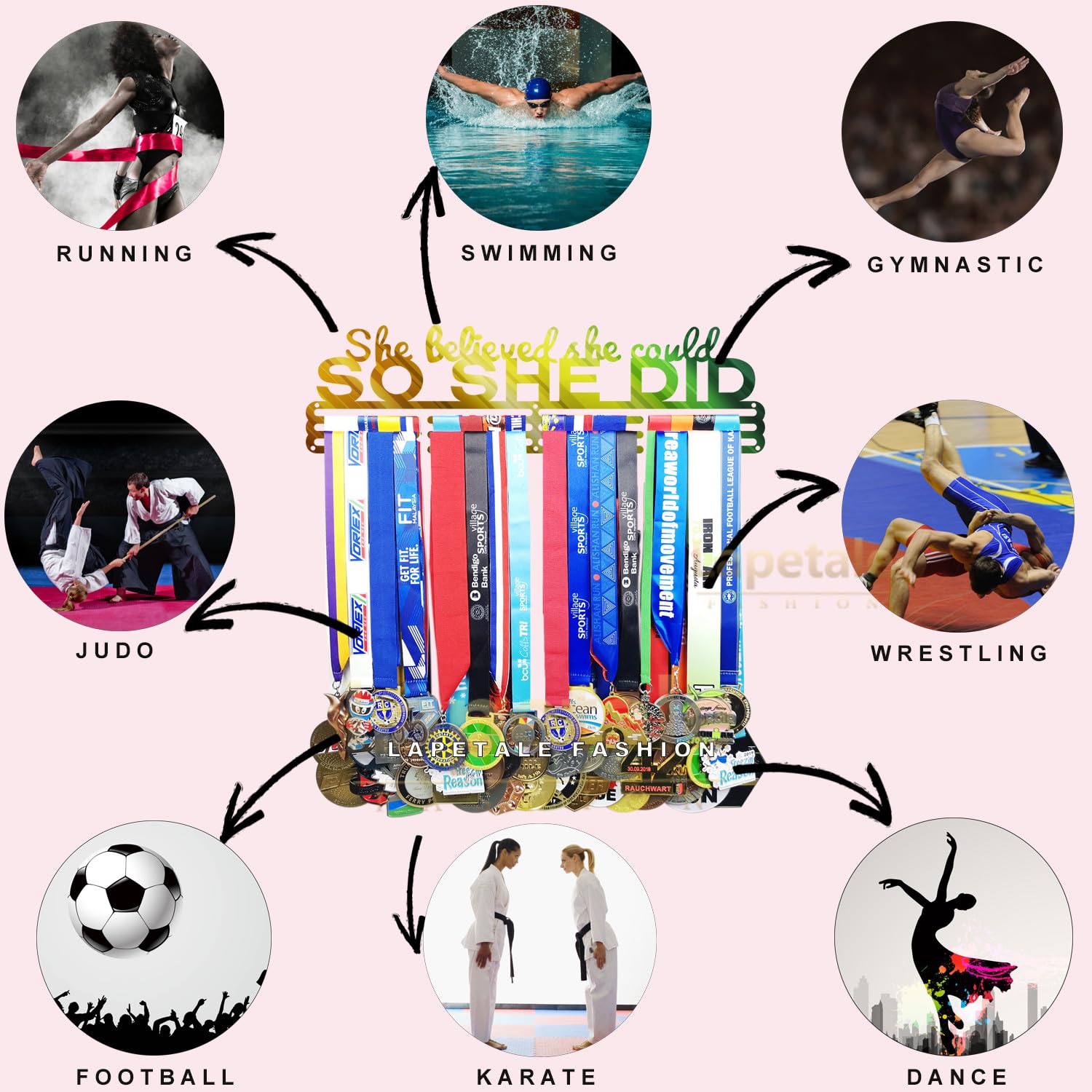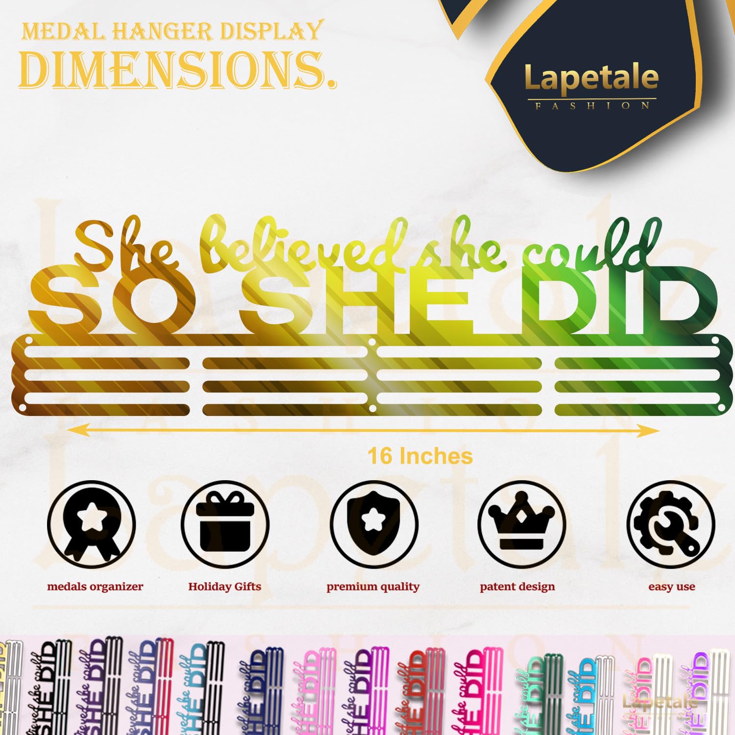 - 【PATENT D889882s】lapetale fashion designed race medal display rack for all medals and ribbons. Medal hanger with sturdy and solid surface better than other similar medal holder display. sports medal hanger can holds up medals and ribbons easily. marathon medal display for sports with sturdy metal material and original design, which different from other race medal holder wall hanger on the market, suit for medals holder display, medal holder for wall gymnastics, soccer, dancing, wrestling