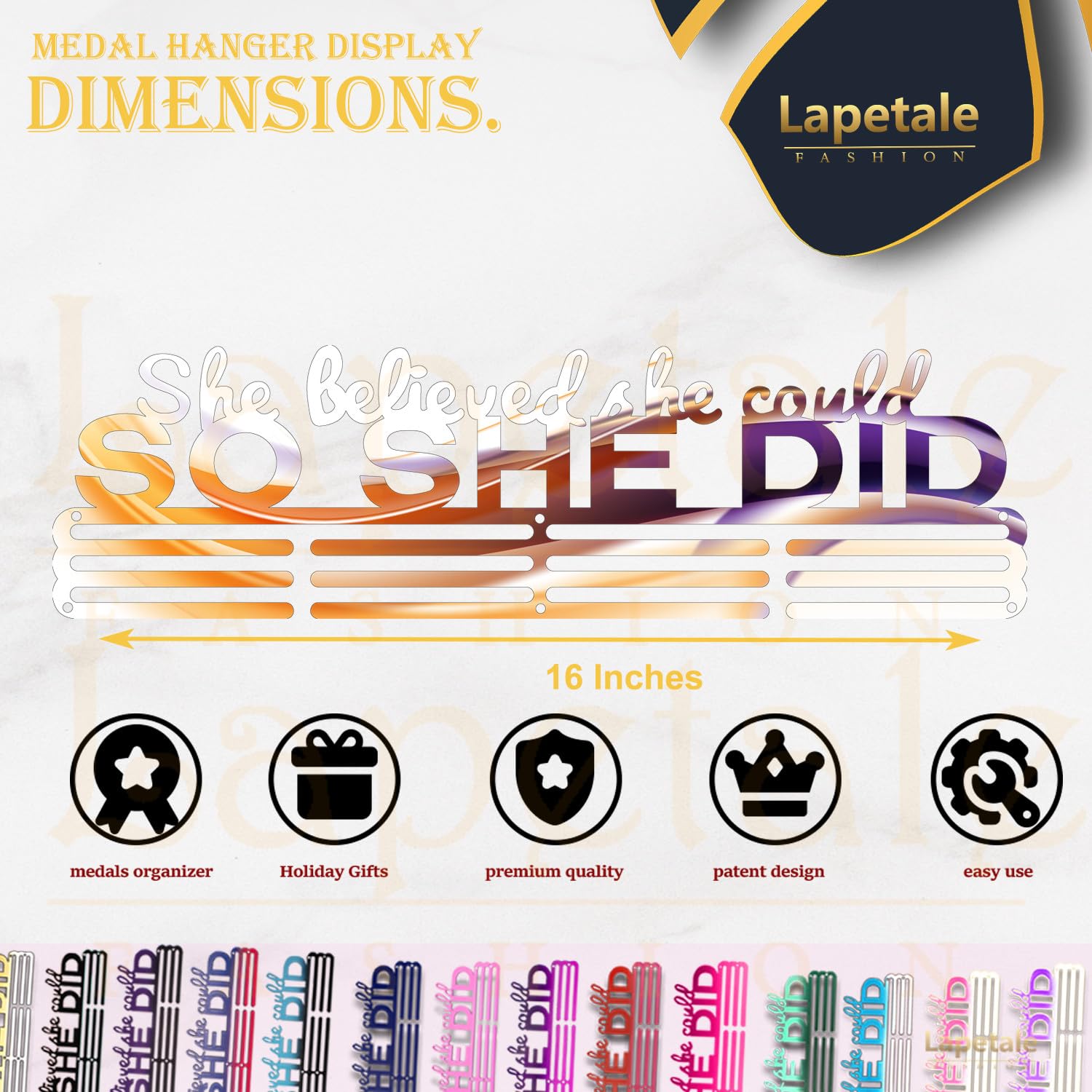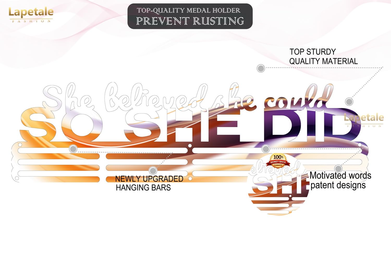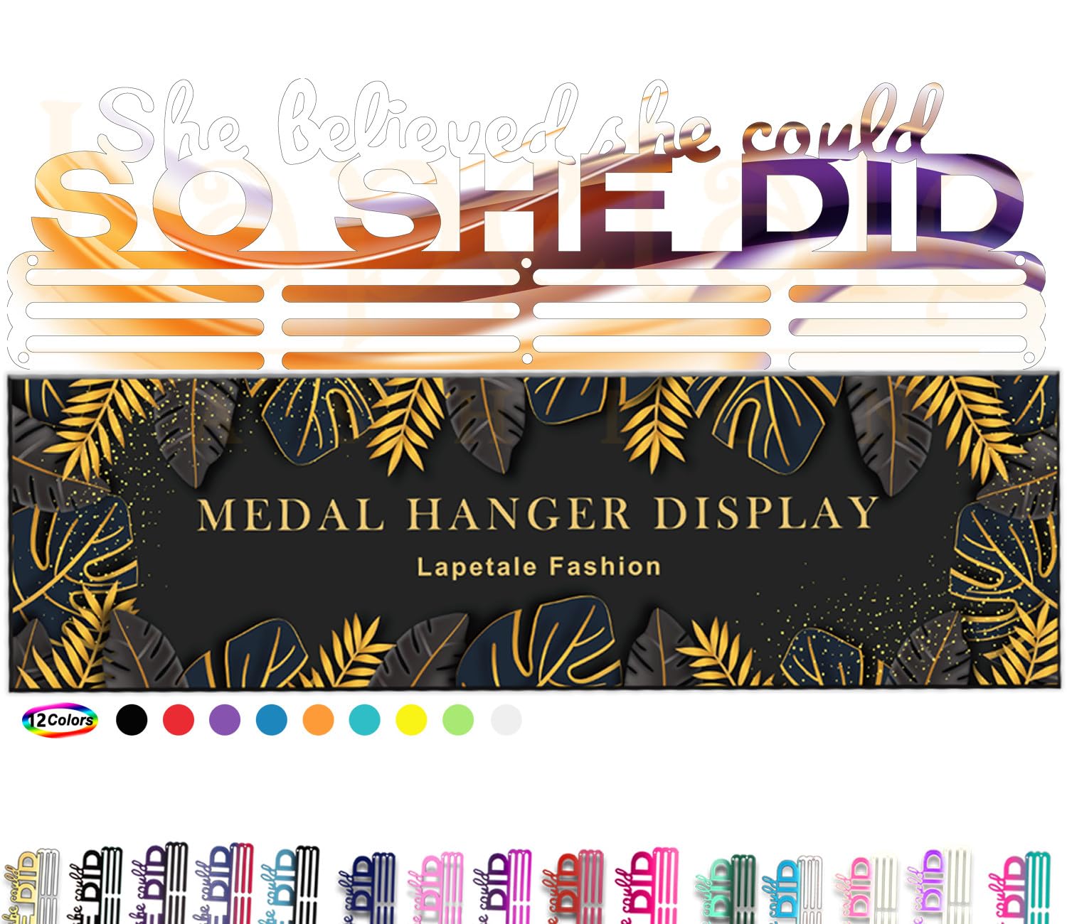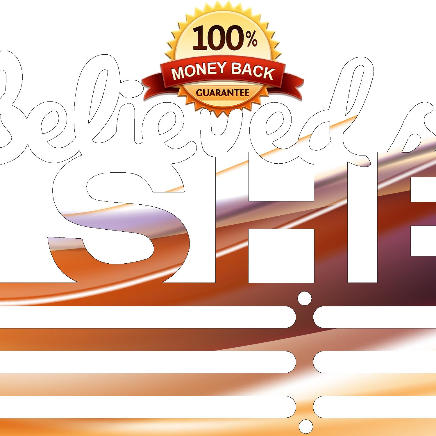 - 【STYLISH MEDAL HOLDER FOR SPORTS】runner medal hanger display design of this display wall mounted is not only a esthetic home decoration but also a great gift for your family or friends. sports medal hanger display won't go missing or collect dust in a drawer or closet; The 'She Believed She Could SO SHE DID ' medal display motivates you to keep pushing your limits and strive for greatness.The size of the metal hanger display: 16 inches long