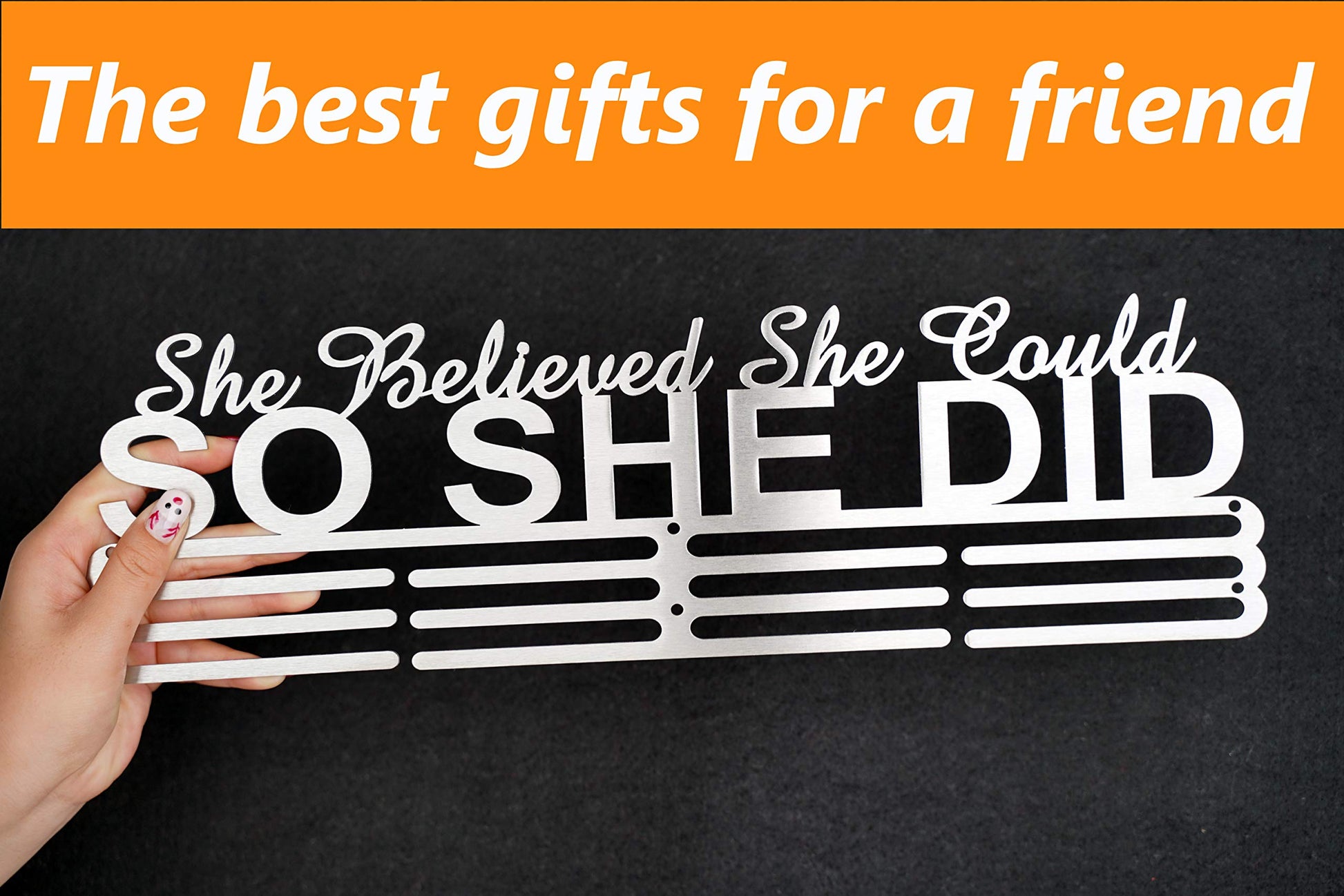 - 【STYLISH MEDAL HOLDER FOR SPORTS】runner medal hanger display design of this display wall mounted is not only a esthetic home decoration but also a great gift for your family or friends. sports medal hanger display won't go missing or collect dust in a drawer or closet; The 'She Believed She Could SO SHE DID ' medal display motivates you to keep pushing your limits and strive for greatness.The size of the metal hanger display: 16 inches long