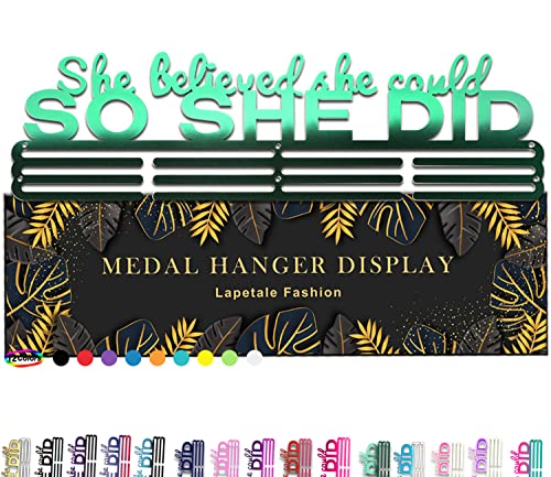 - 【STYLISH MEDAL HOLDER FOR SPORTS】runner medal hanger display design of this display wall mounted is not only a esthetic home decoration but also a great gift for your family or friends. sports medal hanger display won't go missing or collect dust in a drawer or closet; The 'She Believed She Could SO SHE DID ' medal display motivates you to keep pushing your limits and strive for greatness.The size of the metal hanger display: 16 inches long