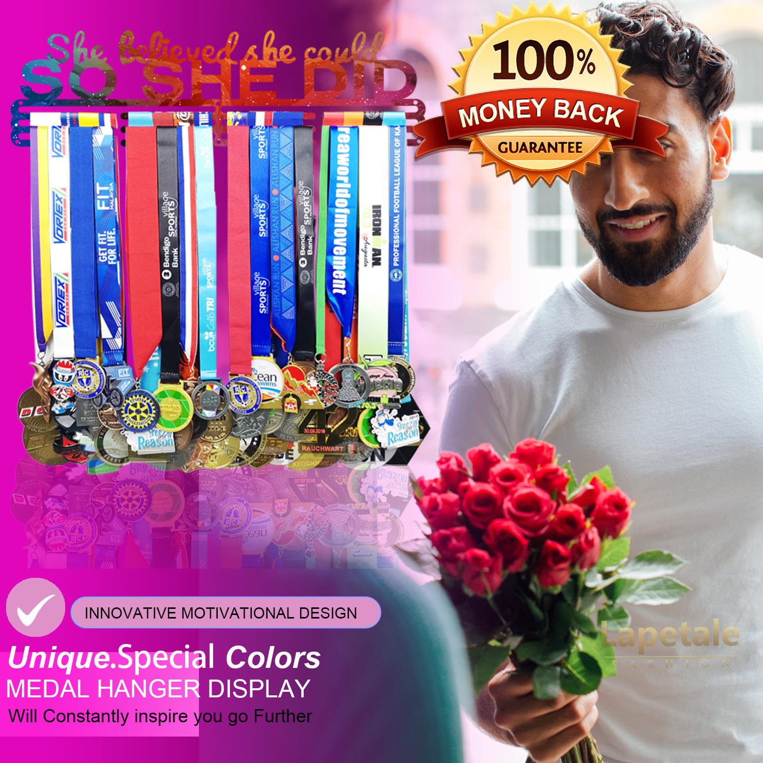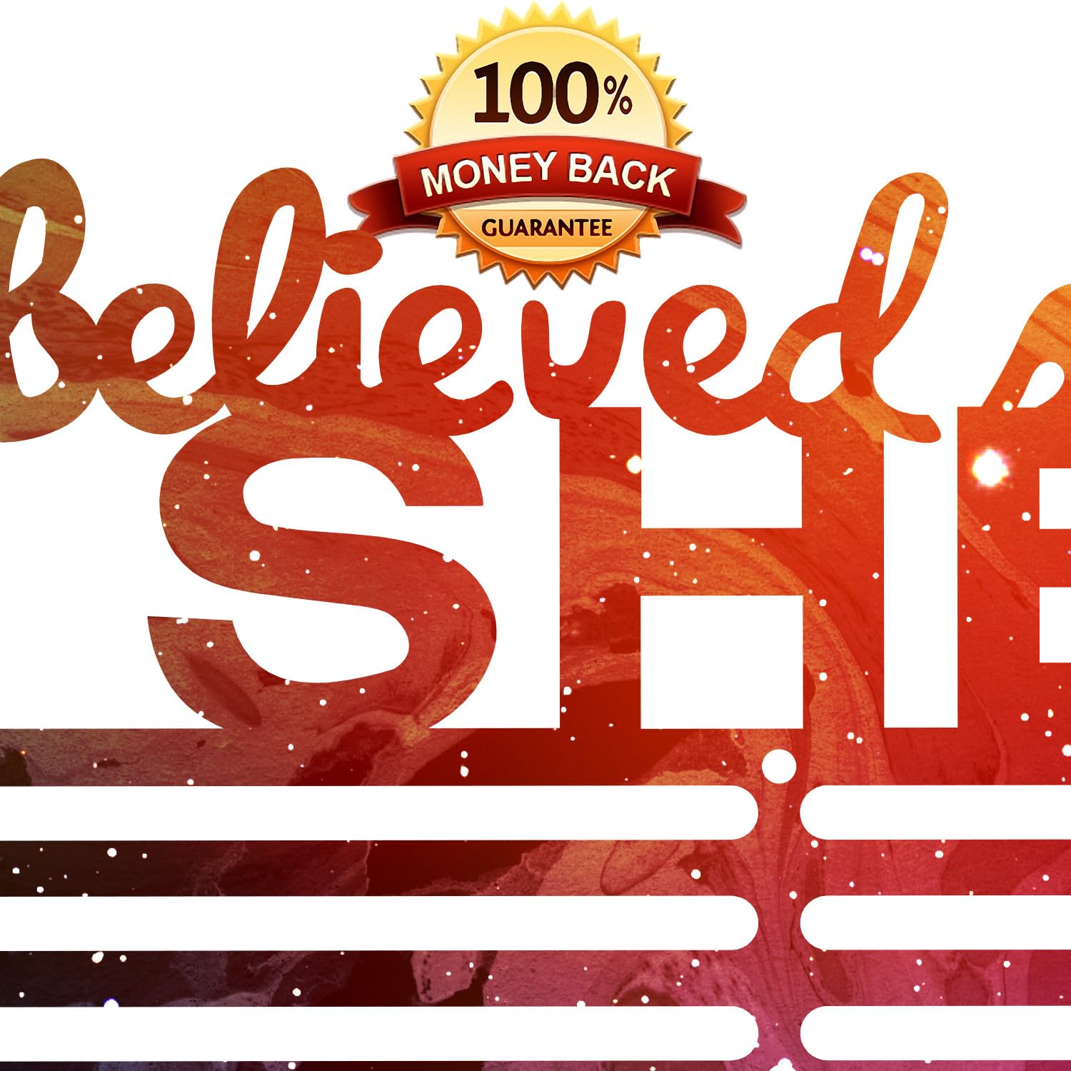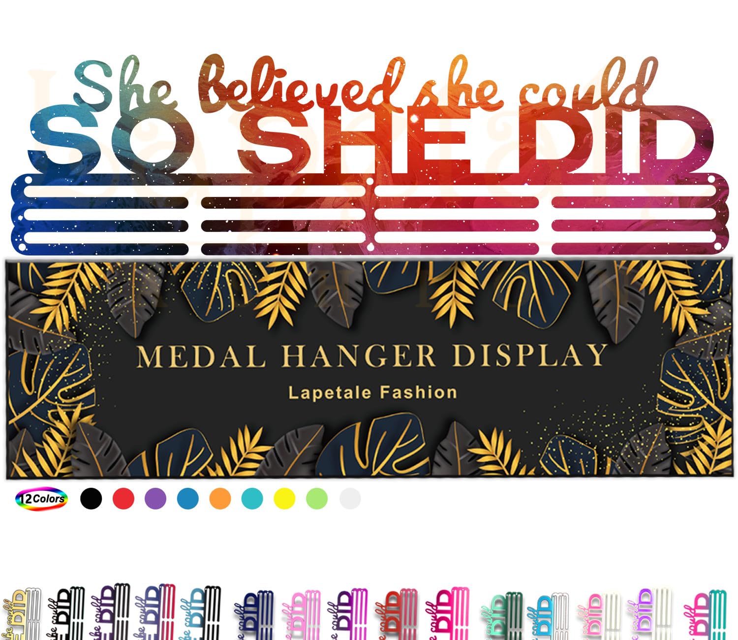 - 【STYLISH MEDAL HOLDER FOR SPORTS】runner medal hanger display design of this display wall mounted is not only a esthetic home decoration but also a great gift for your family or friends. sports medal hanger display won't go missing or collect dust in a drawer or closet; The 'She Believed She Could SO SHE DID ' medal display motivates you to keep pushing your limits and strive for greatness.The size of the metal hanger display: 16 inches long