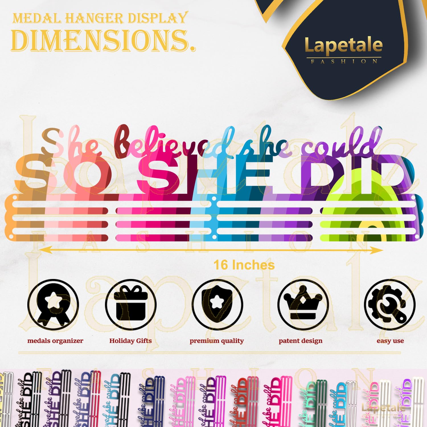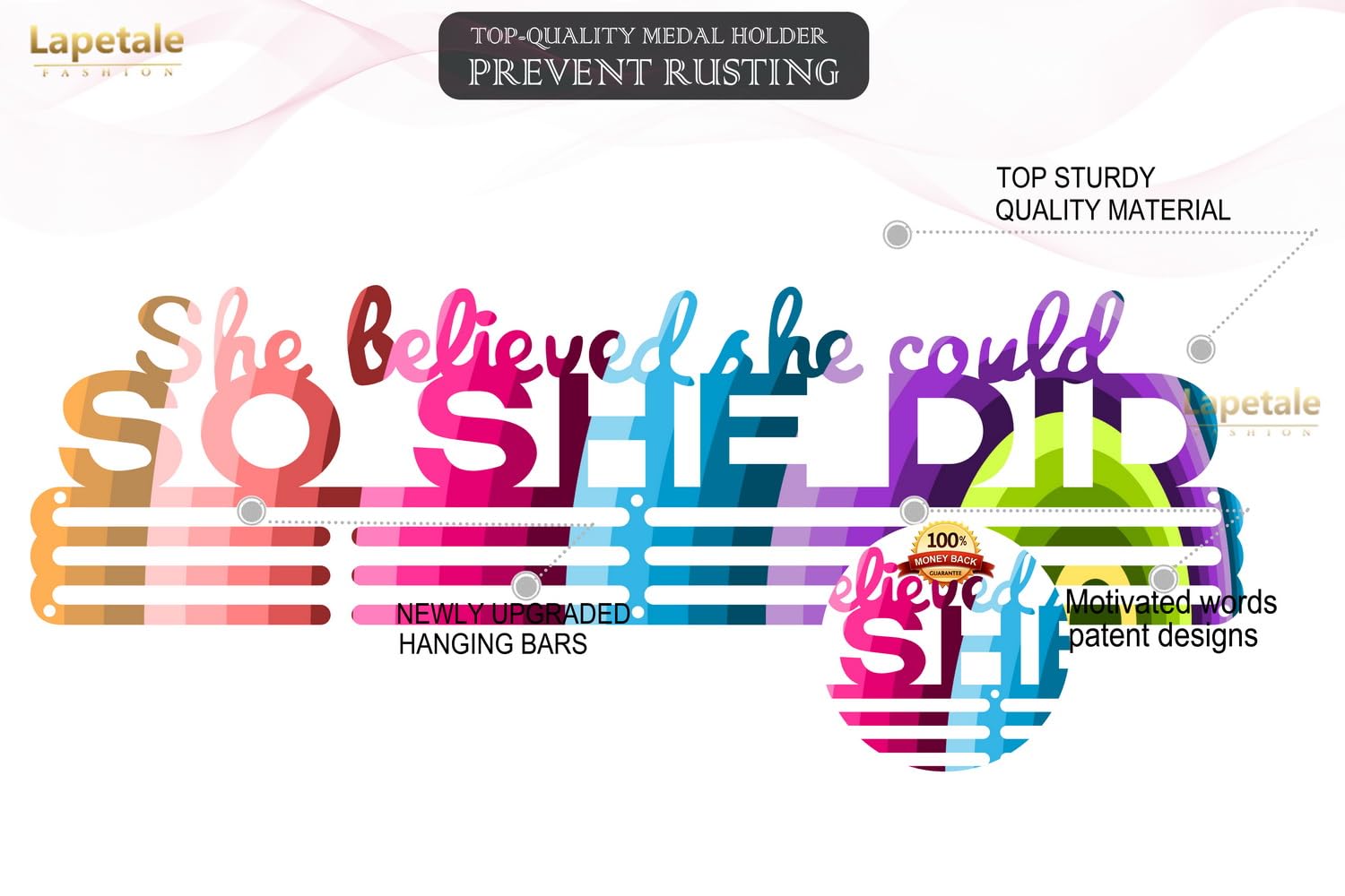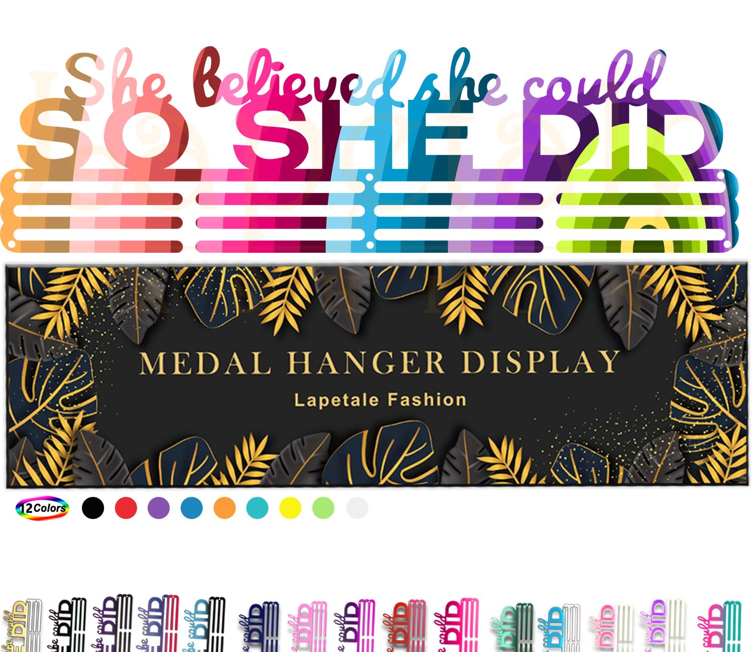 - 【STYLISH MEDAL HOLDER FOR SPORTS】runner medal hanger display design of this display wall mounted is not only a esthetic home decoration but also a great gift for your family or friends. sports medal hanger display won't go missing or collect dust in a drawer or closet; The 'She Believed She Could SO SHE DID ' medal display motivates you to keep pushing your limits and strive for greatness.The size of the metal hanger display: 16 inches long