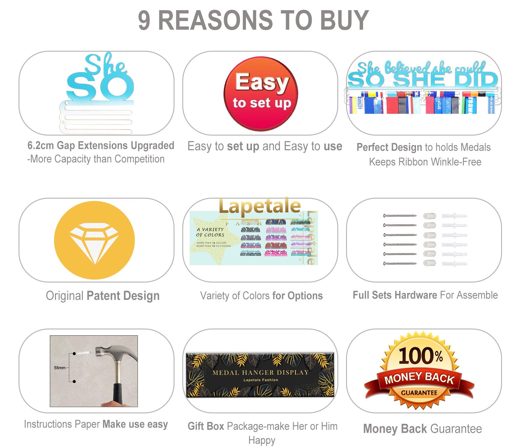 - 【PATENT D889882s】lapetale fashion designed race medal display rack for all medals and ribbons. Medal hanger with sturdy and solid surface better than other similar medal holder display. sports medal hanger can holds up medals and ribbons easily. marathon medal display for sports with sturdy metal material and original design, which different from other race medal holder wall hanger on the market, suit for medals holder display, medal holder for wall gymnastics, soccer, dancing, wrestling