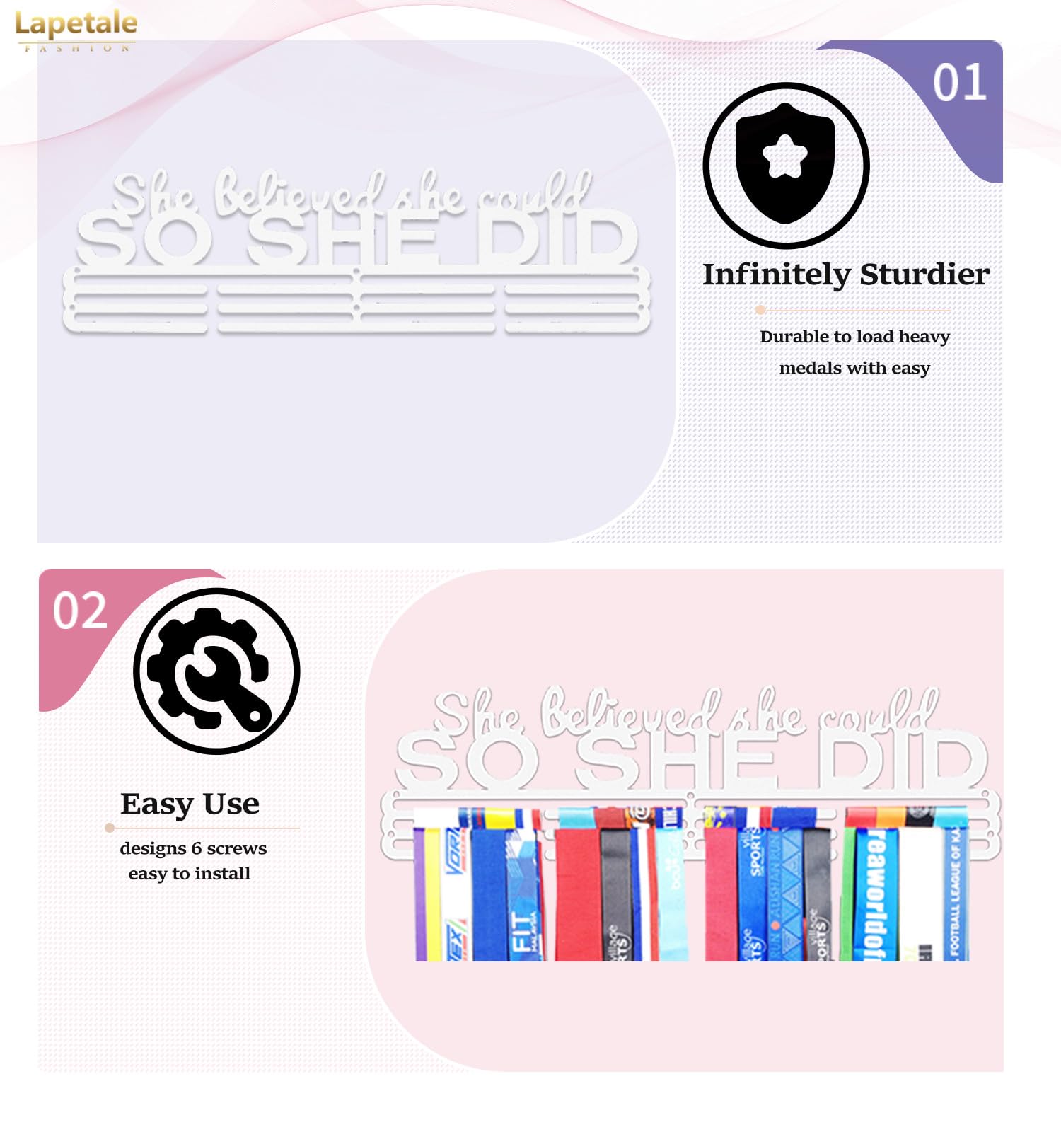 - 【PATENT D889882s】lapetale fashion designed race medal display rack for all medals and ribbons. Medal hanger with sturdy and solid surface better than other similar medal holder display. sports medal hanger can holds up medals and ribbons easily. marathon medal display for sports with sturdy metal material and original design, which different from other race medal holder wall hanger on the market, suit for medals holder display, medal holder for wall gymnastics, soccer, dancing, wrestling