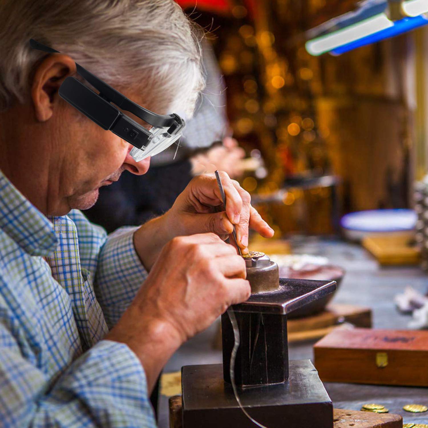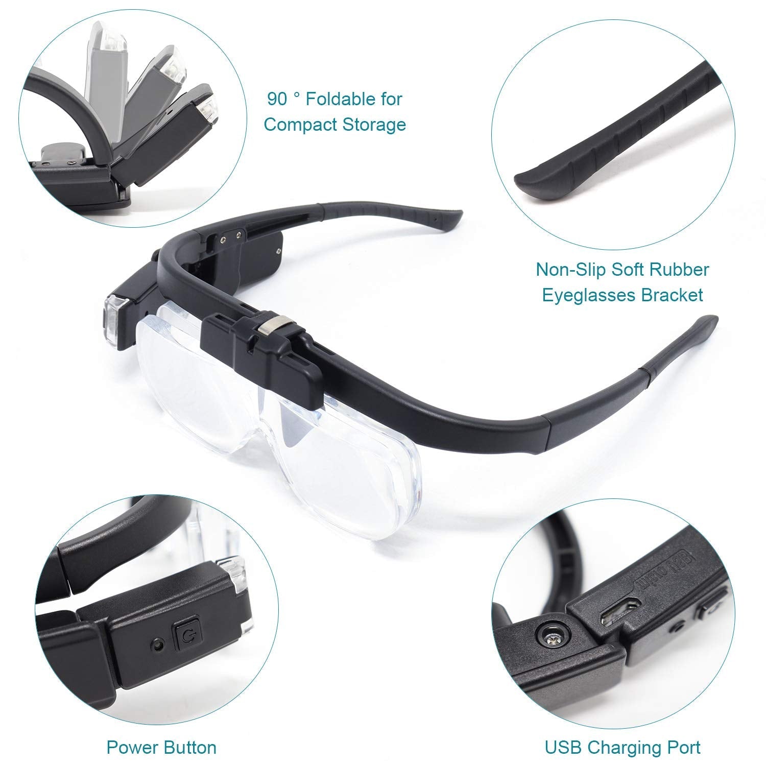 LED Head Mount Magnifier Glasses with 3 Detachable Lenses 2 Led Professional Jeweler Loupe Light USB Rechargeable Hands Free Headband Magnifying Glass for Reading Watch & Electronic Repair Sewing