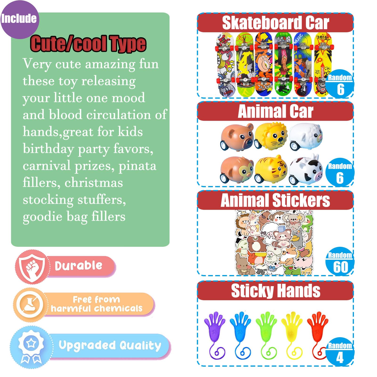 - Super cool Assortment toys:107 pc Party Favors Provide 6-10 kids party toys,include 4 Mini Push pop Keychain,2 Sling Shot Chickens, 10 mini Stretchy String, 6 Mochi, 6 Finger Skateboard, 4 cute animal car, 10 Sticky Hands,4 Mini Pop it toys,60 Animal stickers, 4 Squeeze dinosaurs.